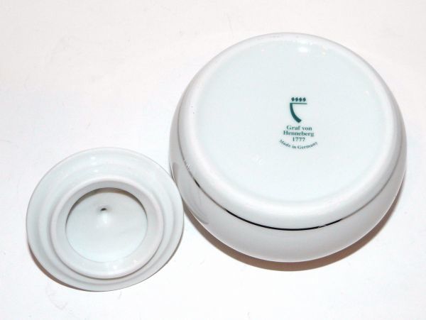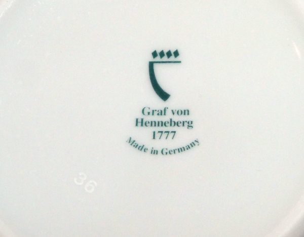 | ブランド | Graf von Henneberg(グラーフ フォン ヘンネブルグ)Henneberg Porzellan は1777年にドイツのチューリンゲン地方、イルメナウで生産を始めた"Furstlich Sachsen Weimar Porzellanfabrik"が元になっています。1930年時点では株式会社であった会社が第二次世界大戦で東ドイツになると国有化され1990年のドイツ統一で有限会社になったことが分かります。2002年には社名からは Henneberg がなくなりますがGraf von Henneberg というブランド名で生産が続けられています。 |