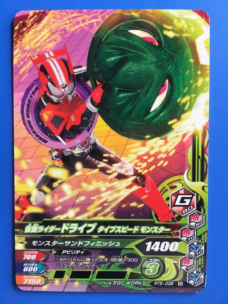 仮面ライダー、ガンバライジング・第RT5弾からNo.038《仮面ライダードライブ・タイプスピードモンスター》の登場です。発送は、普通郵便を利用します。(特にご希望のない場合)おとりまとめも可能ですが、送料に変動する場合がございます。また、送料のご請求は、自宅での計量を基準にご請求させていただいておりますので、実際の金額と差異が出る場合もございます。予めご了承ください。他にも多数出品中です。まとめてこの機会にいかがでしょうか?ご質問お待ちしております。