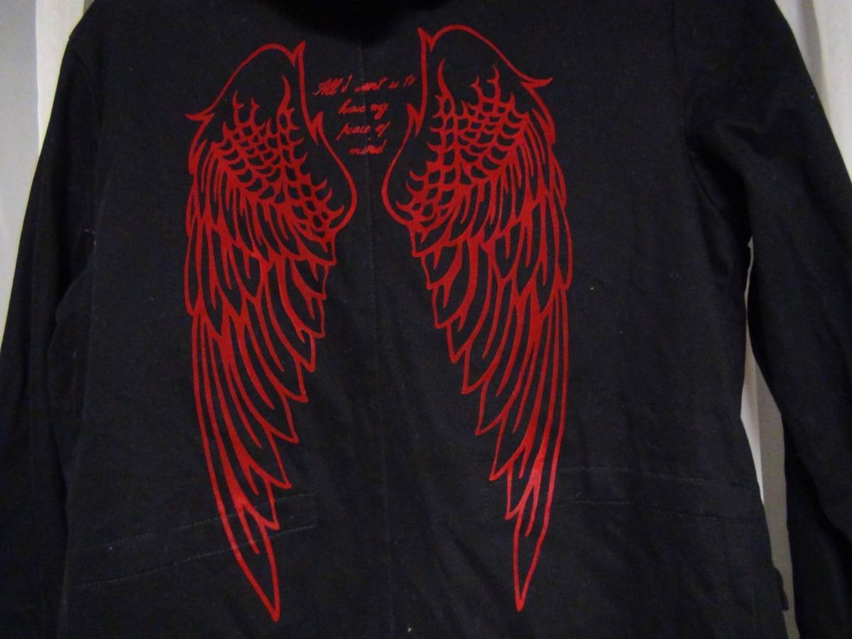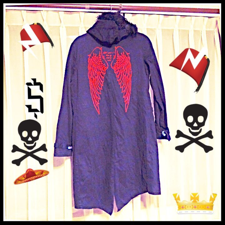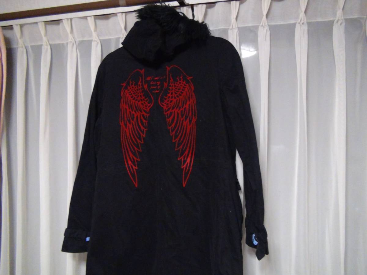見ての通りのカッコの良い赤の羽の柄のロングコートです。