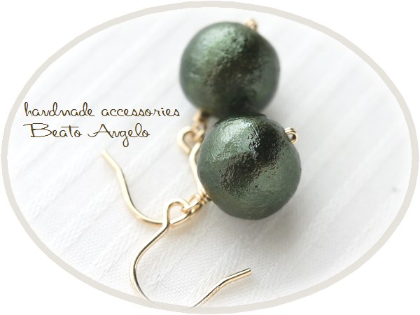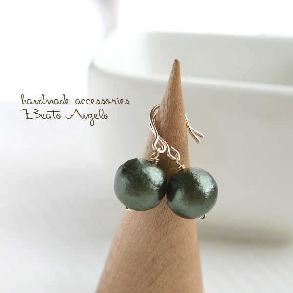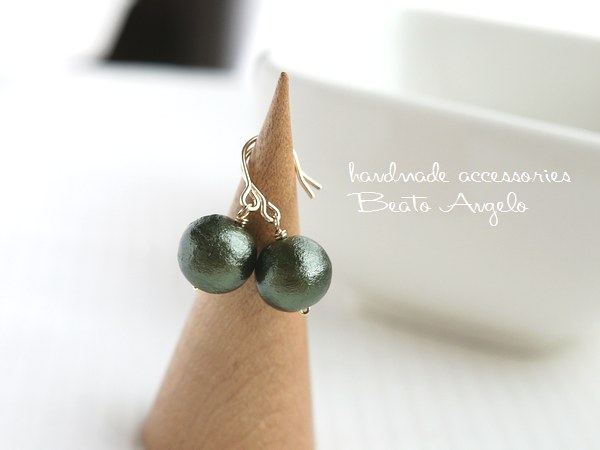 ◇◆+angelo+K14GF コットンパールの一粒ピアス(p-044)ダークグリーン 10mm シンプル