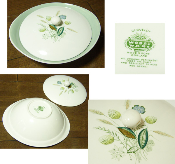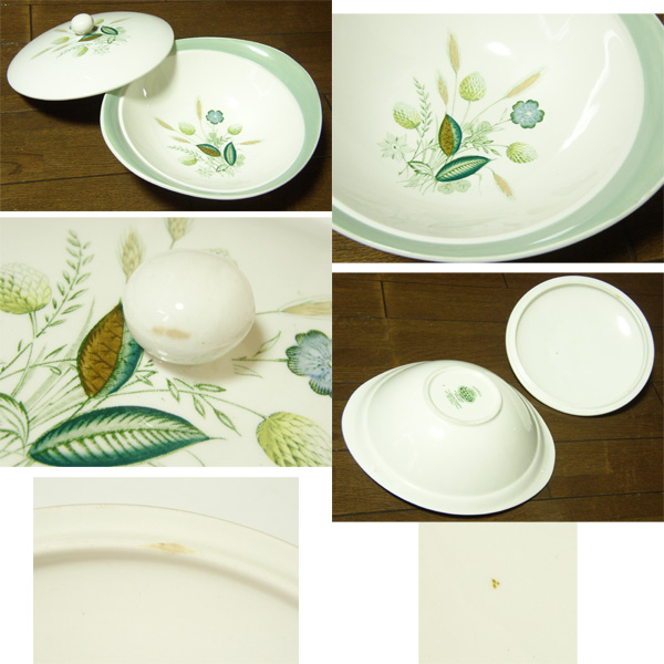 英国購入 ビンテージ WOOD&SONS チュリーンです。状態は、古い物ですので、小さい擦り傷や、丸い持ち手横に薄汚れと(画像3)、上蓋の裏と縁に汚れがありますが(画像3下)、ビンテージの雰囲気ある物です。イギリスで購入しました。デザインや色合いがとても可愛いです。裏に印があります。古い物ですので、状態はそれなりですが、年代物の風格とレトロ感ある物です。縦23cm、横幅26cm、高さ10cmです。ビンテージ物とご理解頂いて、ノークレーム、ノーリターンでお願いします。