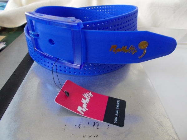 Pop Molly(ポップモリー) のベルトとバックは、一見ゴムに見えるが、Thermoplastic resin(熱可塑性樹脂)という技法で作られている。熱を加えたり冷却することによって、自由自在の形作りが出来る。また、環境に優しい為、リサイクル にも貢献できると考えられて製作されている。