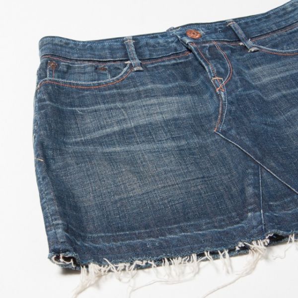 アーネストソーンのデニムミニスカートです。デニムの風合いと裾のほつれ加工が良い雰囲気で、ヴィンテージをリメイクしたようなデザインのアイテムです。秋冬にはニット、ブーツで合わせて頂くのがお勧めです。