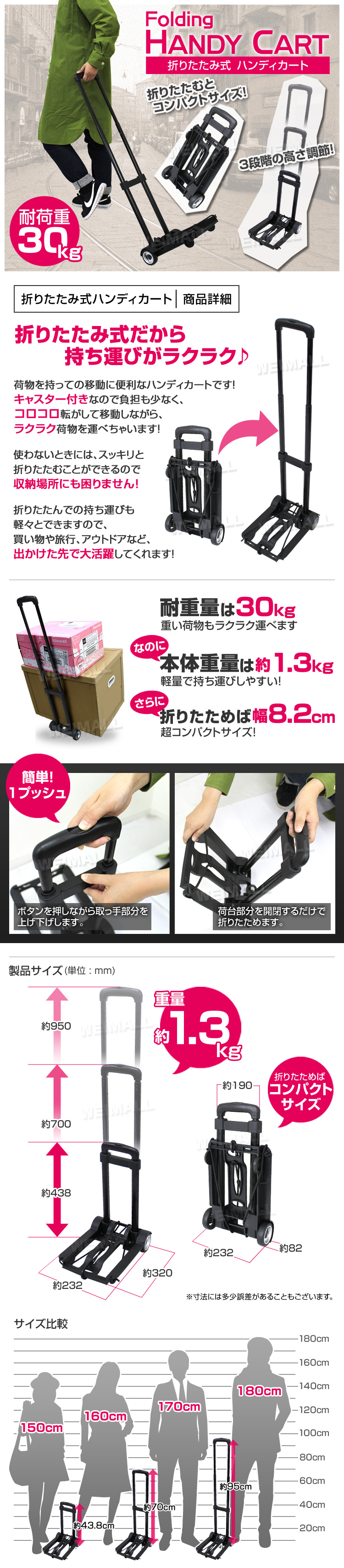 | キャスターが付いているのでコロコロ転がして荷物を運べちゃいます♪ 耐荷重30kgの頼れるタイプ。さらにハンドルの高さは3段階調節が可能! ゴムハンドル付きで荷物もしっかり固定できます。 使用しない時は折り畳めるので場所もとりません! クーラーボックスや灯油タンク、雑誌・新聞を一度運ぶなど重たい荷物をラクラク移動できるキャリーカートです。 キャスターが付いているのでコロコロ転がして荷物を運べちゃいます♪ 耐荷重30kgの頼れるタイプ。さらにハンドルの高さは3段階調節が可能! ゴムハンドル付きで荷物もしっかり固定できます。 使用しない時は折り畳めるので場所もとりません! 重量は約1300gととても軽いので女性でも軽々と持ち上げれます。 車に積めるコンパクトタイプ! 使い方もいろいろ!一家にひとつあると重宝すること間違いなしです! ■商品仕様■ サイズ(約):幅232×奥行320×高さ950mm(ハンドルを最大に伸ばした時) サイズ(約):幅232×奥行82×高さ438mm(折りたたみ時) ハンドル高さ(約):438mm/700mm/950mm 重量(約):1.3kg 耐荷重:30kg 材質:ポリプロピレン、スチール ※仕様・デザインは改良のため予告なく変更することがあります。 【もちろん新品未使用品です】 ▼検索キーワード キャリーカート カート 折りたたみ キャリー 軽量 ハンドキャリー 折りたたみ式キャリーカート アウトドア キャンプ用品 便利グッズ スポーツ レジャー グッズ バーベキュー お買い物 折り畳み アルミ クーラーボックス 人気 おすすめ |