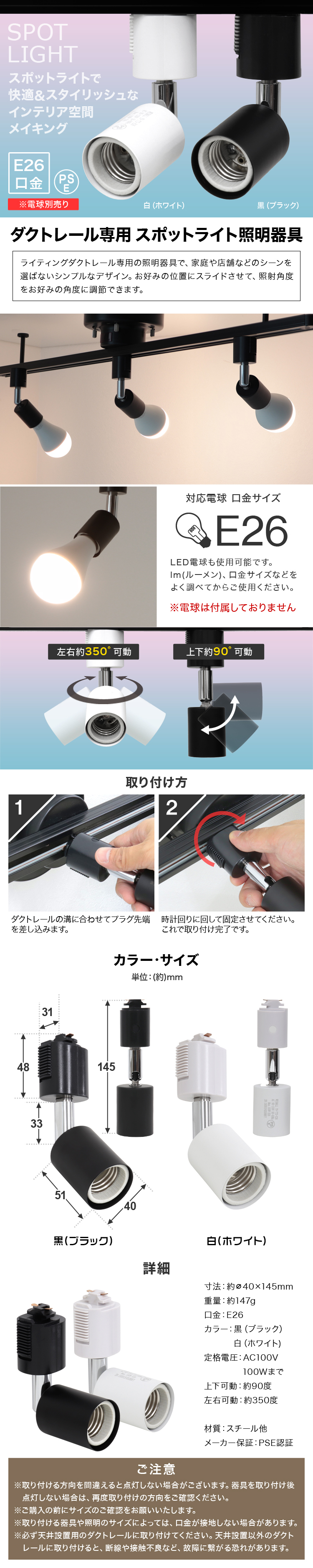 照射角度をお好みの角度に調節可能! お好みの位置にスライドさせてご使用いただけます。 シーンを選ばないシンプルなデザインで空間をスタイリッシュに演出します。 ●商品詳細 内容:本体×8 (※電球別売) カラー : ブラック サイズ :(約)145×40mm 重量:(約)147g 口金:E26 可動角度 :上下可動:(約)90° 左右可動:(約)350° 定格電圧 :AC100V 100Wまで 材質:スチール他 PSE認証:取得済 保証期間 :7日間 ※商品到着後7日以内の初期不良・破損のみご対応させていただきます。 |
