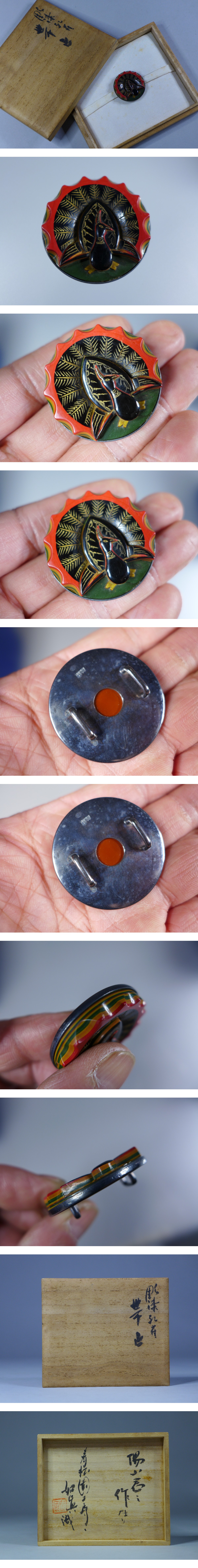漆芸家『昇寿園陽山作 彫漆孔雀帯留』人間国宝磯井如真の識箱 本物保証品です。直径:約36mm。厚み6・6mm。とても珍しい作品です。状態良好。状態は画像参照でお願いします。★★★★★★★★★★★★★★★★★★★★★★★★★最近、悪質な入札者が多く非常に迷惑をしております。新規IDや「非常に悪い・悪い」の評価の多い方の入札はお断りさせて頂きます。 仮に入札があった場合でも、発見次第入札を削除させて頂く場合がございます。
