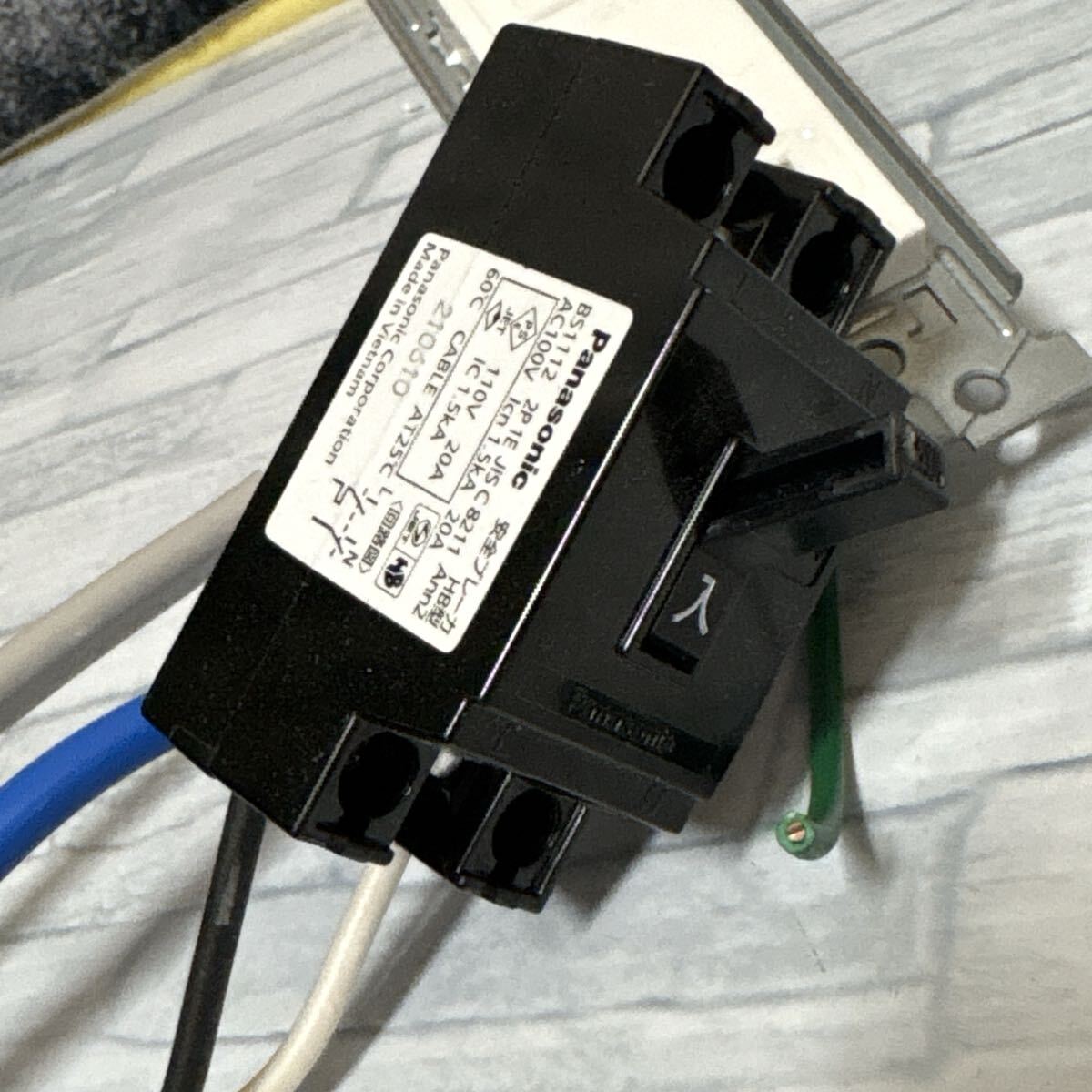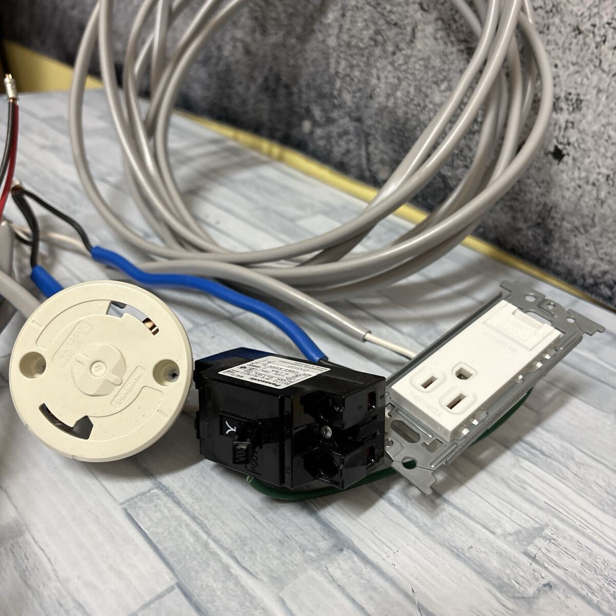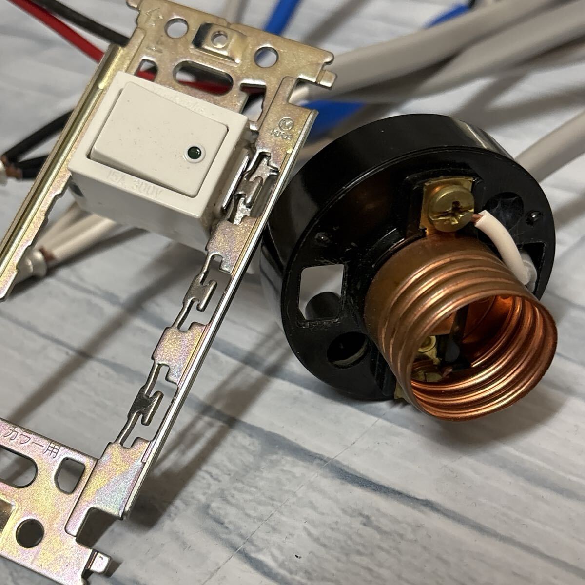 Panasonic製スイッチ、TOSHIBA製アース付きコンセント、引掛けシーリング、E26口金ソケットを組み合わせた電気配線セットです。