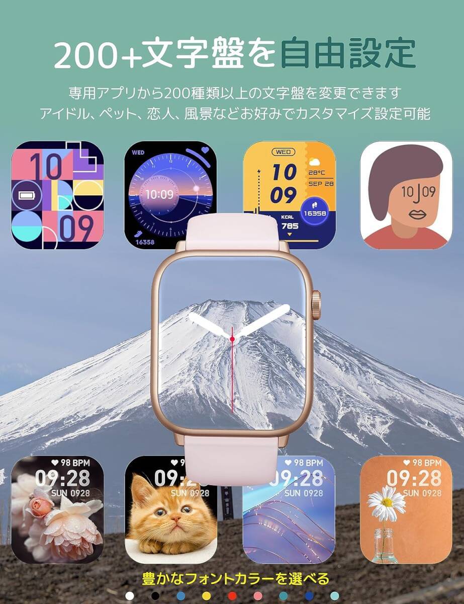 Bluetooth通話&音声認識】このスマートウォッチはBluetooth通話機能で、電話を受けたり掛けたりすることも、電話帳を作ることも、着信履歴を残すことも可能です。音声アシスタントを利用すれば、あなたの声で、エクササイズの開始や停止、ニュースや情報、天気のチェック、タイマーやアラームの設定、スマートウォッチの操作などが可能です。音質をよりクリアに改良し聞きとりやすくしたり、従来のスマートウォッチをより進化させたりと、高音質で多機能なアイテムだとしています。【大切なメッセージは見逃しなく】互換性のあるスマートフォンとペアリングすれば、あらゆるスマート機能に手首から簡単にアクセスできます!LINE、Instagram、Twitter、Facebook、Gmailなど多種のSNSが対応、メッセージ通知や着信があった際に振動で通知されます。会議中や満員電車などのスマホを取り出せない状況でも、すぐに内容をチェックでき、大切な連絡を見逃しません。Android4.4とI0S8.0以上のスマートフォンに適用!【1.85インチ大画面&多種類文字盤 】1.85インチの大画面と高解像度などの要素を組み合わせており、3 Dサーフェスガラスの工芸に合わせて、より高い解像度の視覚体験とスマートフォンのようなタッチ触感を楽しめ、もっと便利に操作することができます。例のない快適な視覚感と優れた操作感をもたらします。スマートウォッチの言語に英語/韓語など多国の言語を自由に設定できます。更に、文字盤DIY機能もあり、携帯電話中の写真を利用して、お好きな文字盤を作る事もできます。毎日のお気持ちによって、新たな活力を注ぎます。好きな文字盤スタイルを取り替えましょう。【100多種類な運動モード&実用な機能満載】スポーツウォッチはウォーキング、ランニング、サイクリング、登山、サッカー、ヨガなど、さまざまなスポーツモードがあります。多種類スポーツ組み込み、消費カロリー、運動データ、歩数計、活動量計、距離などを記録して、運動計画の達成に役に立ちます、自分の状態を十分に把握します。走行距離と消費カロリーはもちろん、アプリでライニング時間を設定でき、組み合わせたGPS機能で働作を記録し、運動軌跡などが一目瞭然です。また、着信通知/拒否/通話、輝度調整、天気予報、活動量計、歩数計、長座注意、SOS緊急通話、GPS、スマートウォッチ探し、バイブレーション強度調整、目覚まし時計、カメラ制御、音楽制御/再生など実用な機能が備えます。【日本語アプリ&付属品】 日本語アプリは、Google Play StoreおよびApple Storeからダウンロードできるほか、QRコードを読み取ってダウンロードすることも可能です。注:スマートウォッチはパソコンやタブレットに対応していません。付属品:スマートウォッチの本体*1、日本語取扱書*1、専用充電ケーブル*1