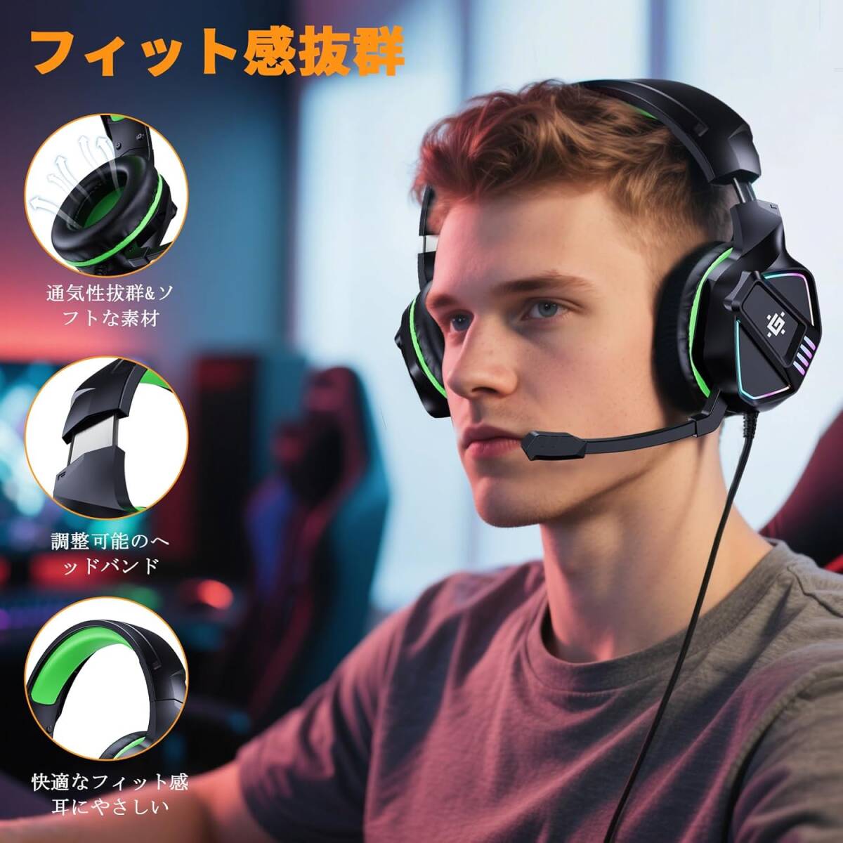 ゲーミングヘッドセット 有線 3.5mmジャック ノイズキャンセリングマイク+高遮音設計 RGBライト PS5/PS4/Xbox/PC対応 黒+緑