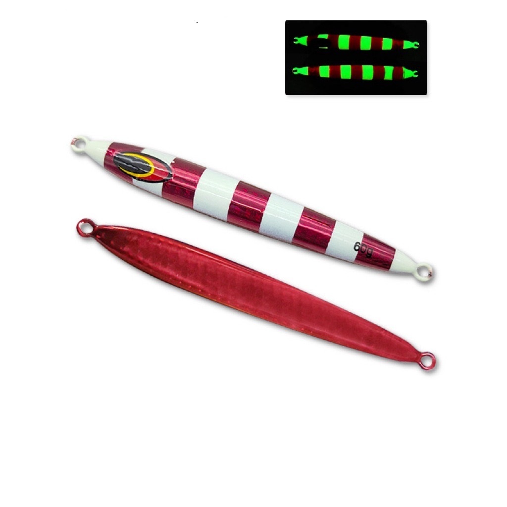 このメタルジグは、ストライプとホログラムのデザインが特徴で、魚を引き寄せるための視覚的魅力があります。