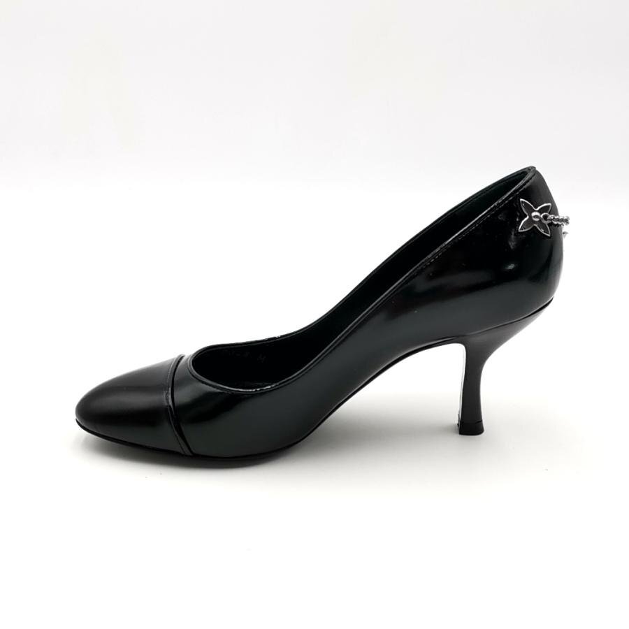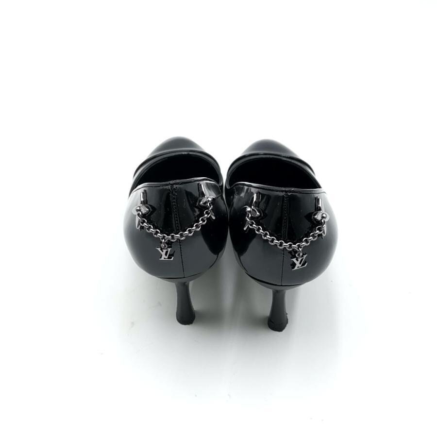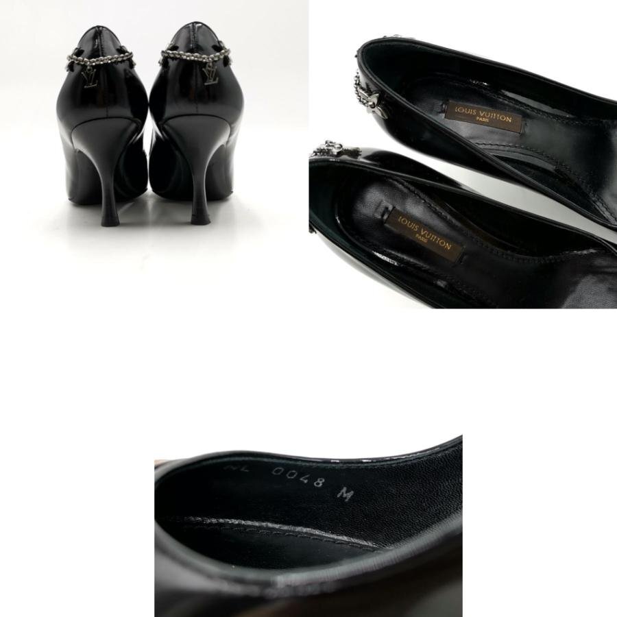 ・送料無料 美品 ルイヴィトン LOUIS VUITTON パンプス 靴 シューズ レザー ストレートチップ NL0048 M LVロゴ チェーン ピンヒール 35 22.5cm相当 伊製 イタリア製 黒 ブラック系 レディース