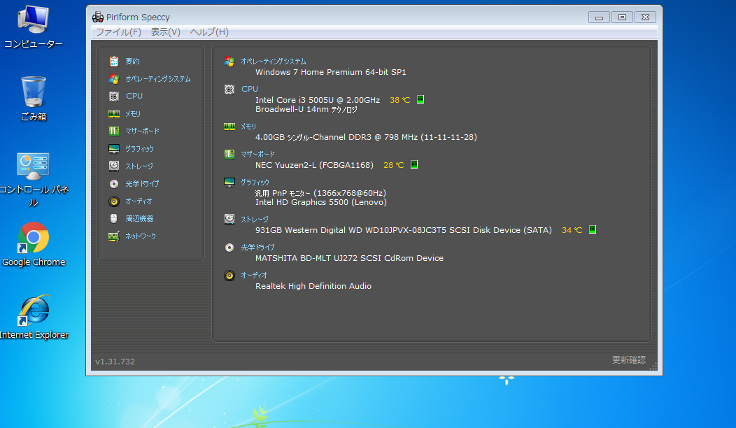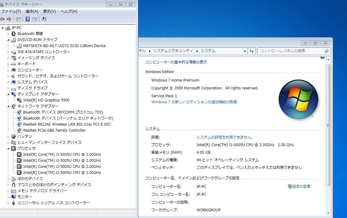 CPU | Intel Core i3-5005U プロセッサー 3M キャッシュ、2.00 GHz |