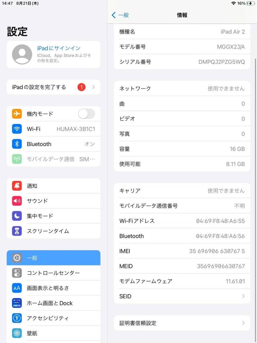 iPad Air 2 Wi-Fi + Cellular 16GB スペースグレイ