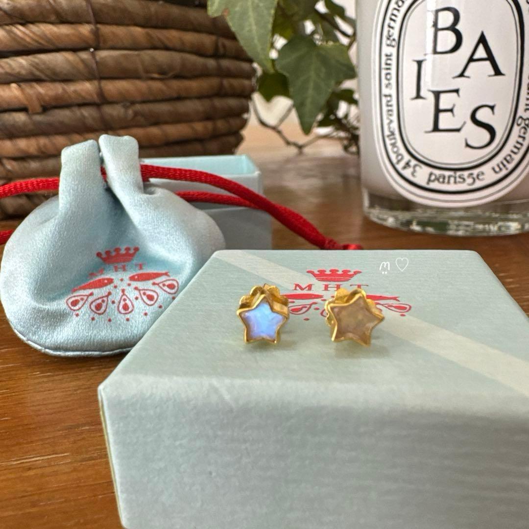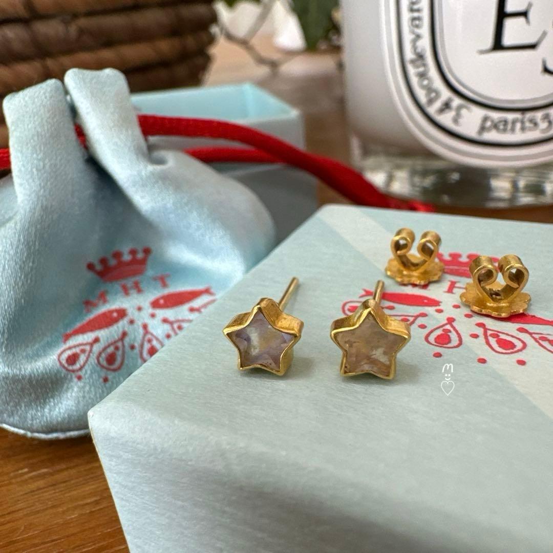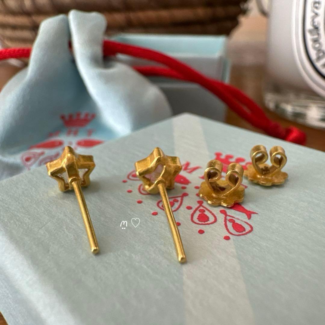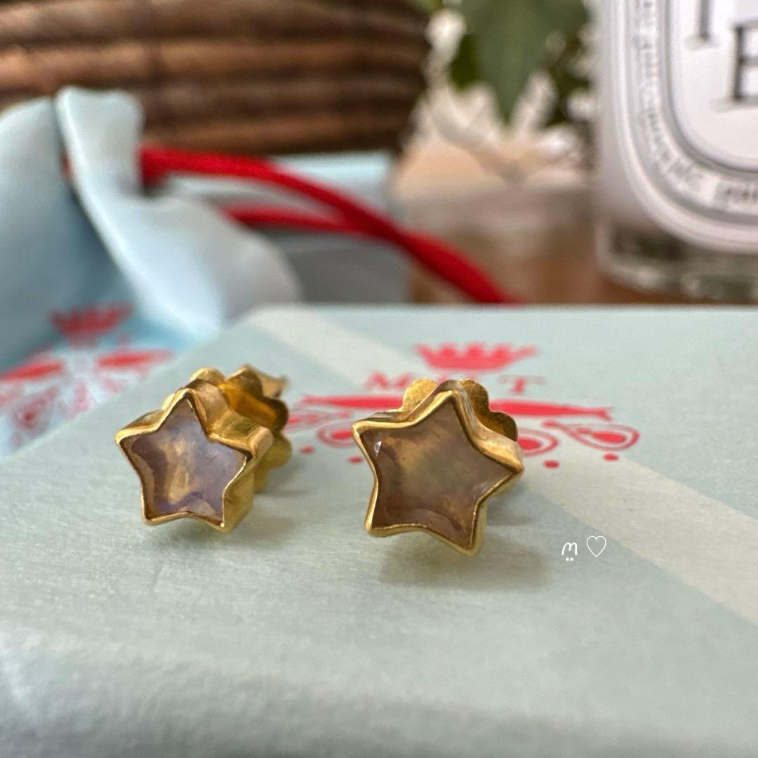 はちみつ色の22ゴールドでかたどられた、スターモチーフのピアス。