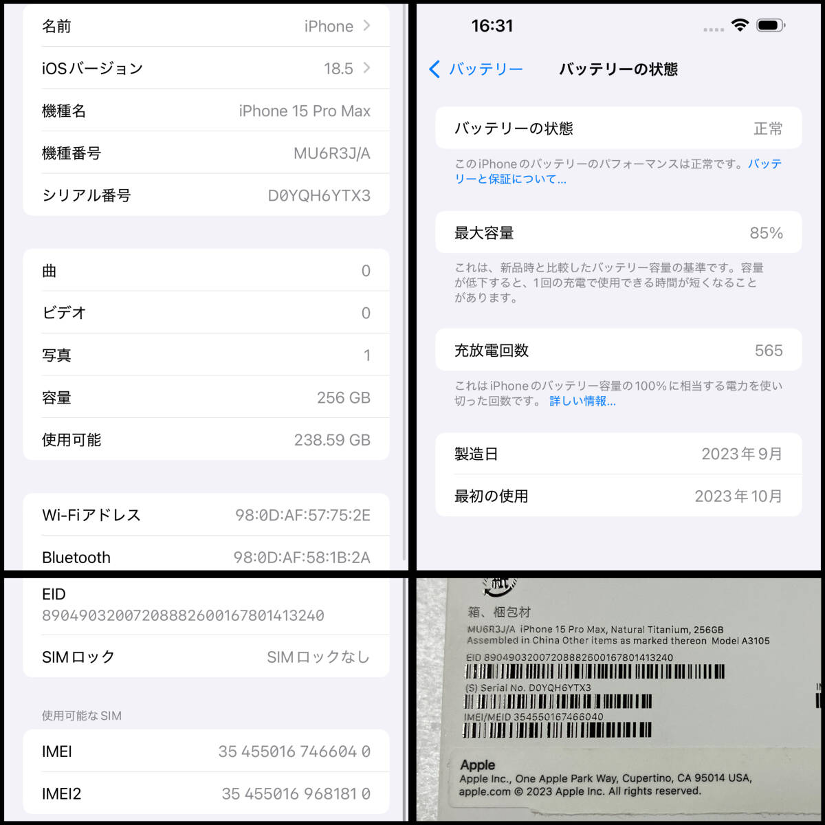 【動作OK】iPhone15ProMax 256GB ナチュラルチタニウム 最大容量85% A3105 MU6R3J/A 利用制限ー SIMフリー Apple アイフォーン スマホ 本体