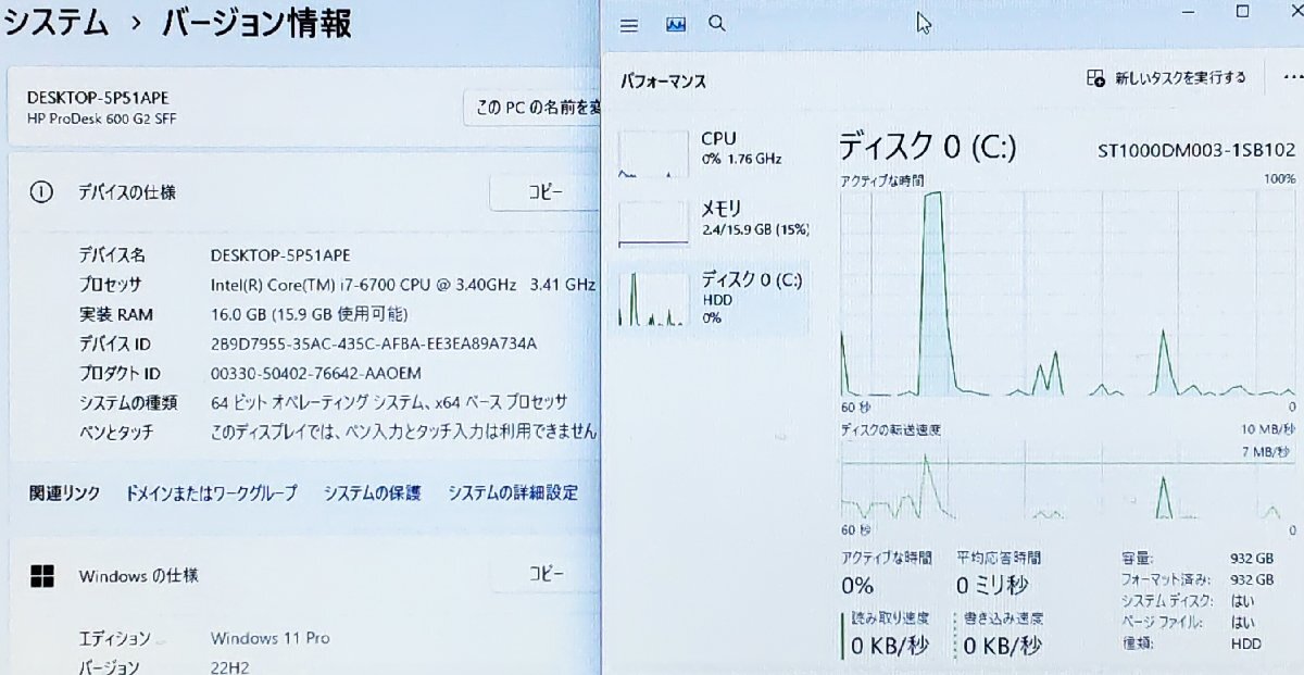 ■■■ 商 品 名 ■■■ ● HP ProDesk 600 G2 SFF ■■ 製 品 仕 様 ■■ CPU: Intel(R)Core(TM) i7-6700 @ 3.40GHz メモリ:16GB HDD:1TB 光学ドライブ:DVD マルチレコーダー OS:Windows11Pro 64bit(要件回避クリーンインストール) 寸法:37cm*34cm*10cm (梱包サイズ140サイズ) 付属品:無し(本体のみ) ■■ 動 作 状 態 ■■ 当方所有のUSBメディアにてデータ消去および Windows11のクリーンインストールを行っております。 ライセンス認証は行っておりませんので 落札者様のお持ちのライセンスでご対応をお願いいたします。 ★OSについて 当品は本来Win11のインストールができないものにクリーンインストールを行ったPCです。 そのため購入後のOS更新につきましては自己責任の上での使用をお願いしております。 簡易清掃のみ行っておりますので取り切れない汚れやほこり、 細かいキズやゴム足などの部分欠損についてはご容赦ください。 神経質な方は入札をご遠慮ください | |||||||||||||||||||||||||||||||||||||||||||||||||||||||||||||||||||||||||||||||||||||||||||||||||||||||||||||||||||||||||||||||||