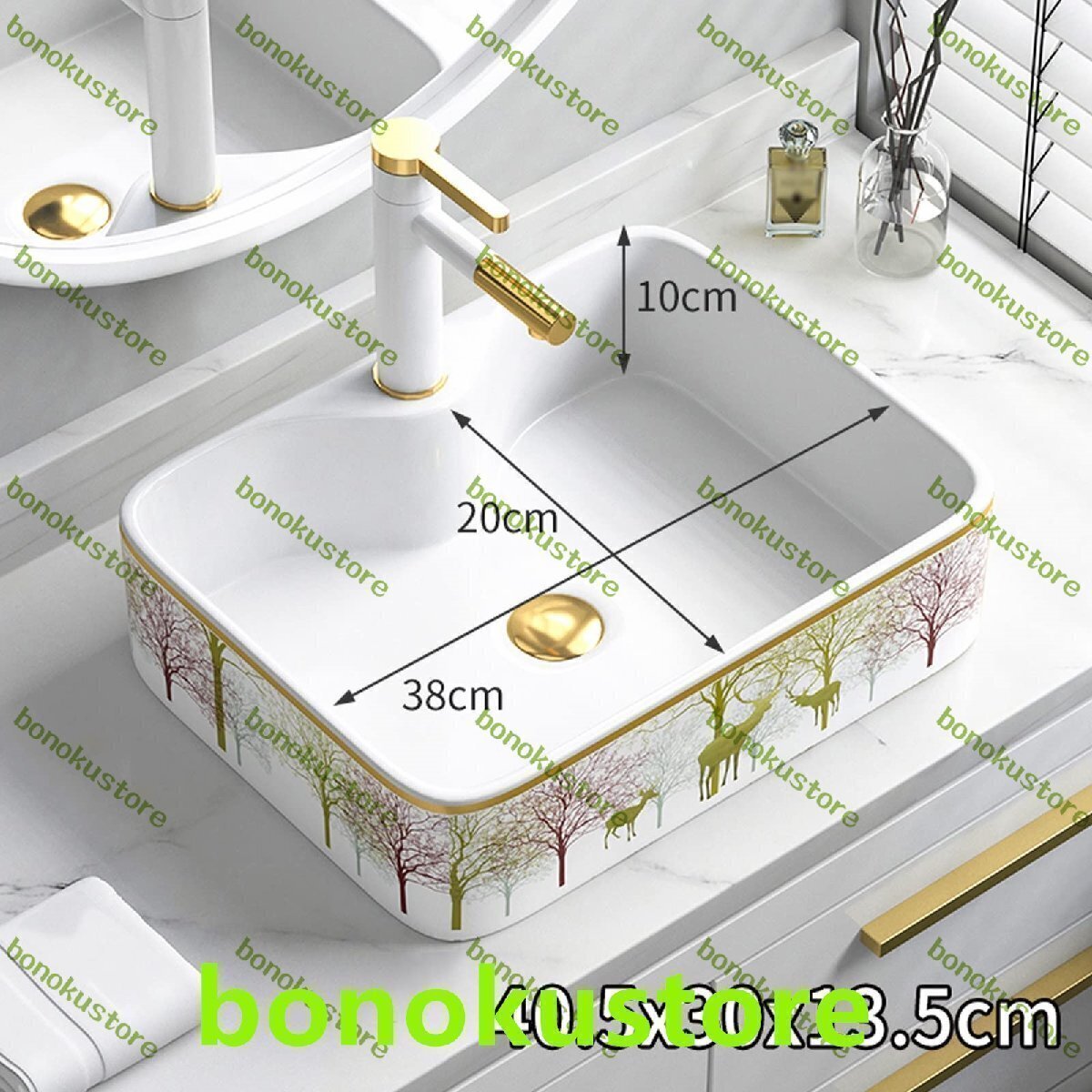 バスルームベッセルシンク 15.9x11.8インチ バスルームベッセルシンク 金メッキ装飾パターン 長方形ベッセルシンク 化粧台カウンター上装飾アート ホワイト磁器セラミックシンク アート洗面台 バスルームシンク
