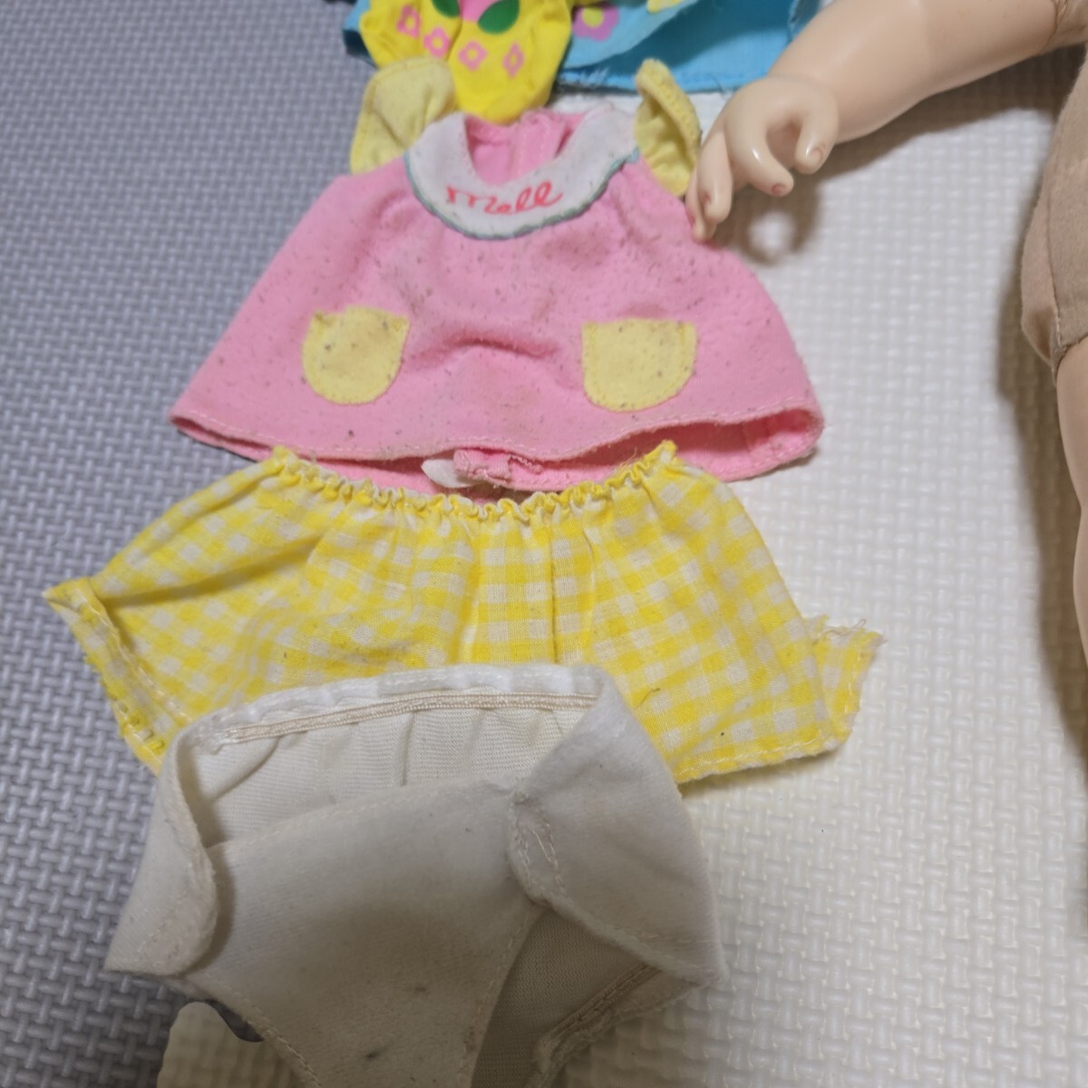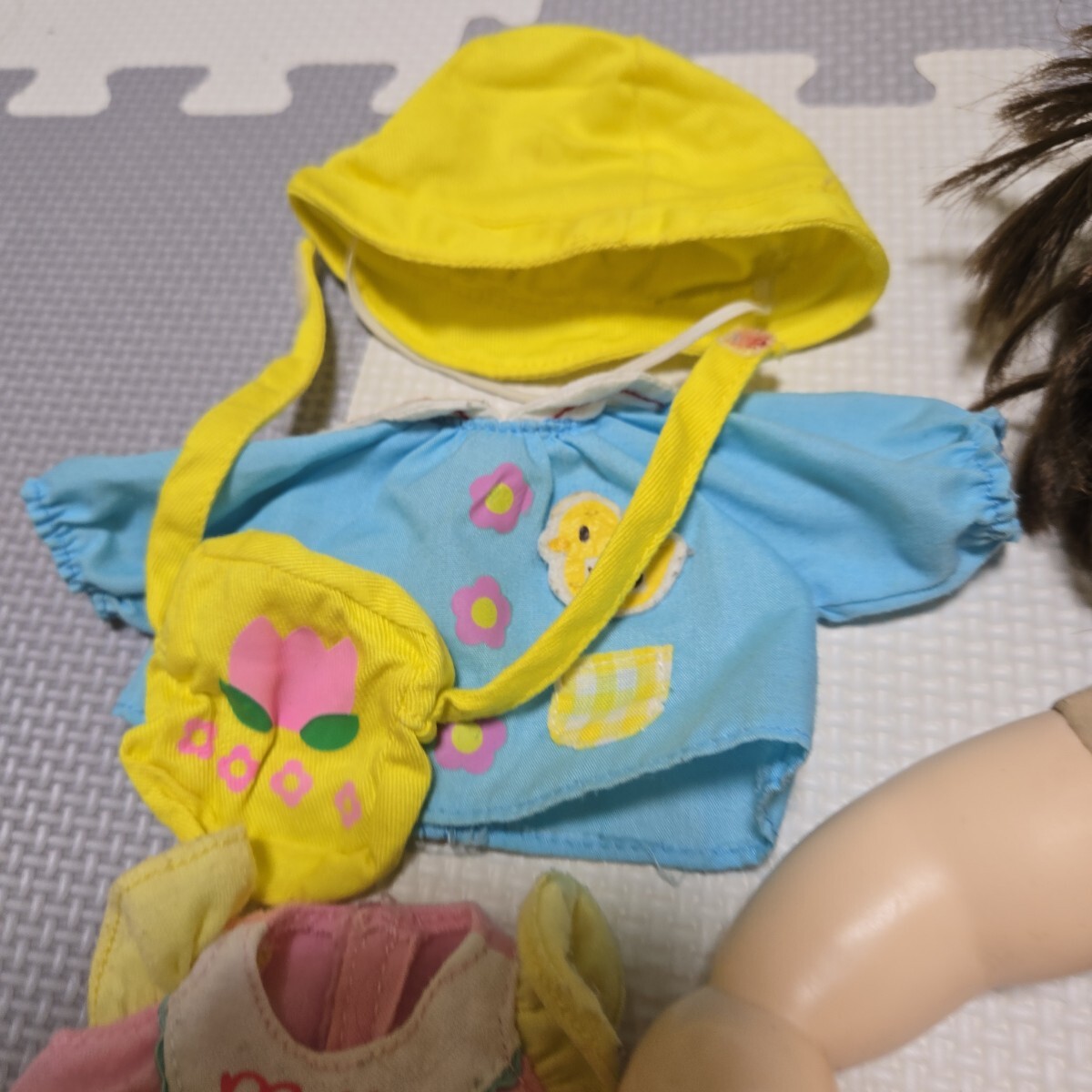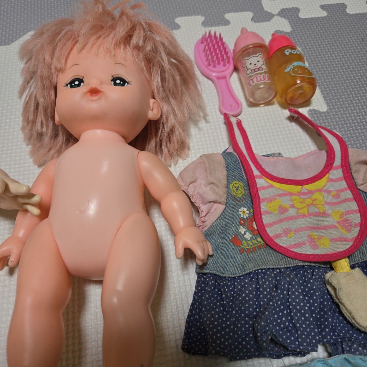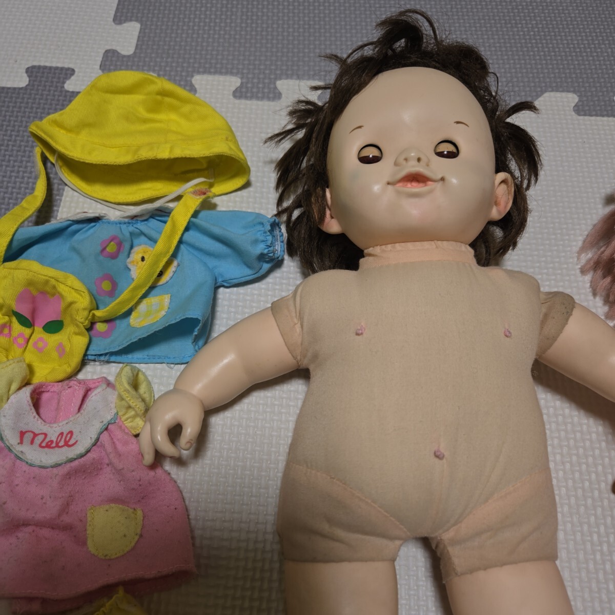 ぽぽちゃん、メルちゃん人形と多彩な服、くし、哺乳瓶がセットになっています。