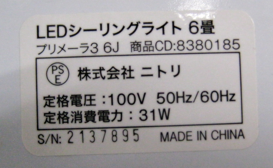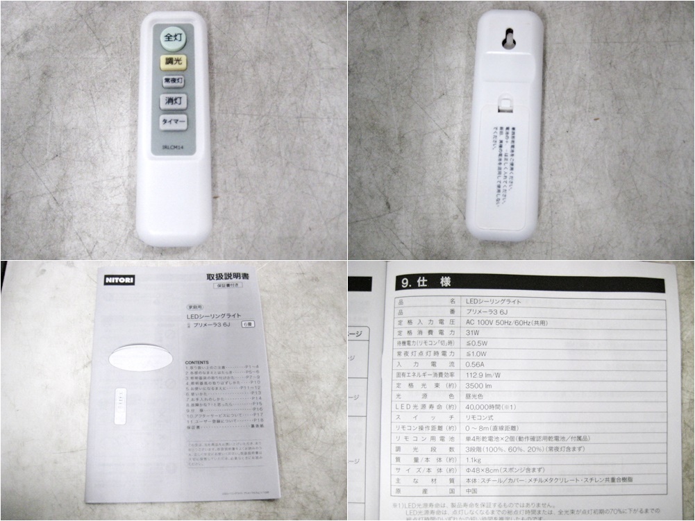 | | ③ニトリ LED シーリングライト プリメーラ3 6J 動作良好 6畳 調光 リモコン付き LED照明 天井照明 昼光色 NITORI 308ZS | |