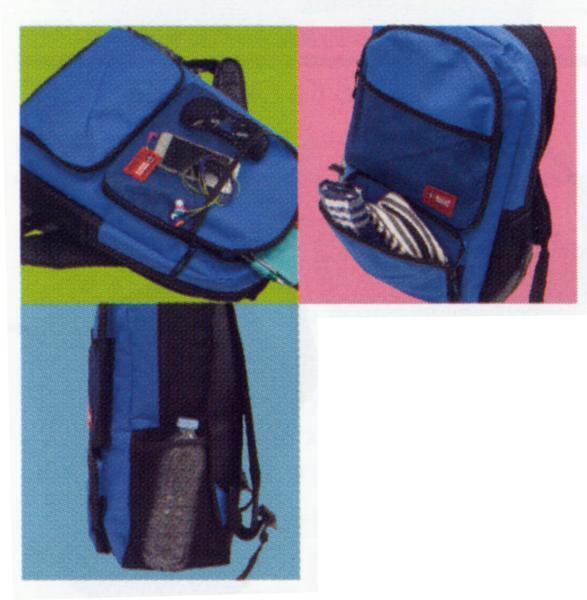 前面:メッシュポケットx1、ラウンドファスナーポケットx1