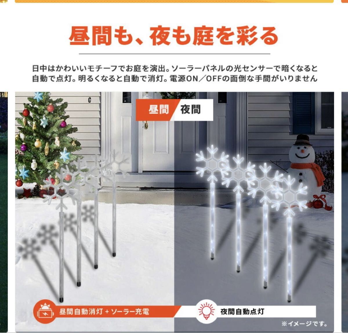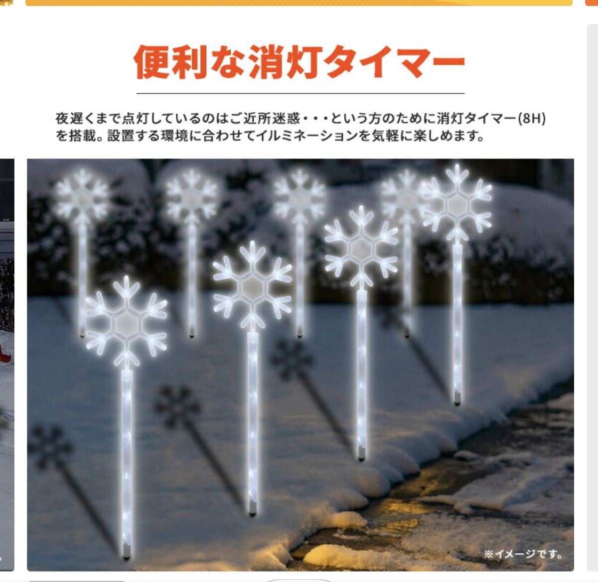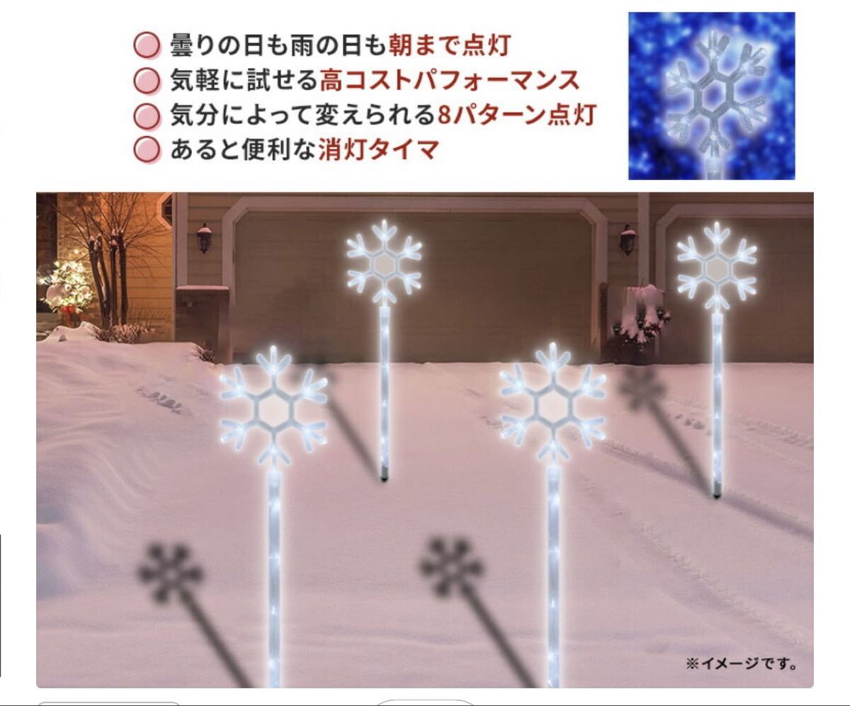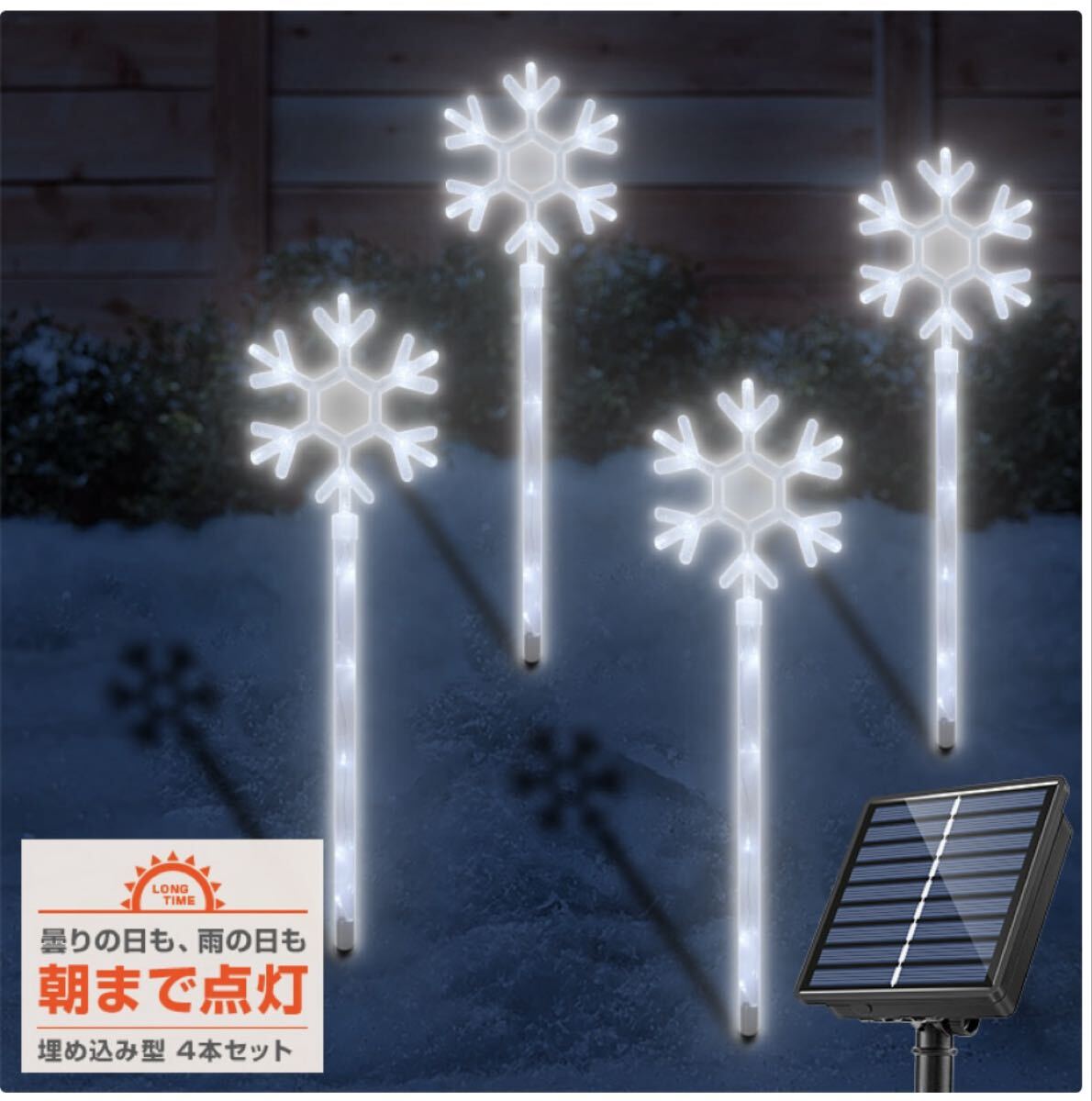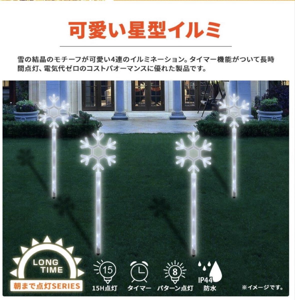 雪の結晶のモチーフが可愛い4連のイルミネーション。タイマー機能がついて長時間点灯、電気代ゼロのコストパオーマンスに優れた製品です。