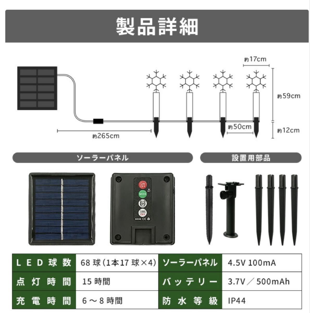 商品内容ソーラーイルミネーション4連組(ソーラーパネル含む)本体×1、パネル用支柱×2、電飾用支柱×4