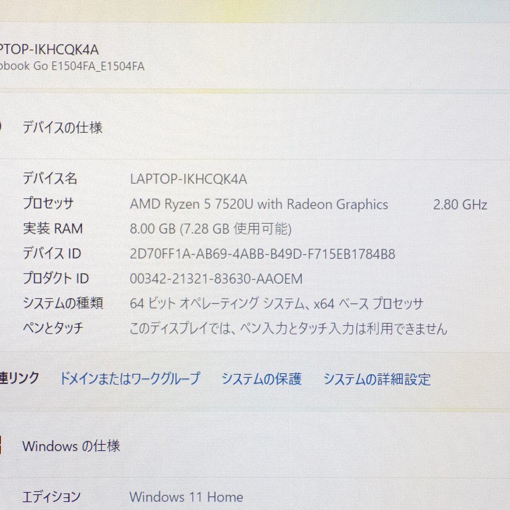 | <主な仕様> メーカー:ASUS 製品名:Vivobook Go 15 製品型番:E1504FA-R585KWS CPU:Ryzen 5 7520U メモリ:8GB ストレージ:SSD512GB OS:Windows11 Home ディスプレイ:15.6インチ インターフェース:USB3.2 (Type-C/Gen1) ×1、USB3.2 (Type-A/Gen1)×1、USB2.0×1HDMI 寸法:幅360.3mm×奥行き232.5mm×高さ18.5~19.0mm <商品の状態> こちらの商品は【 USED/美品 】になります。 外装特筆すべきダメージ見られず良好な状態でございます。 動作確認済み。Officeライセンス付属しません。 別途:その他、いろいろ出品しています |