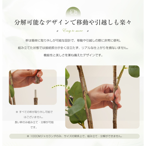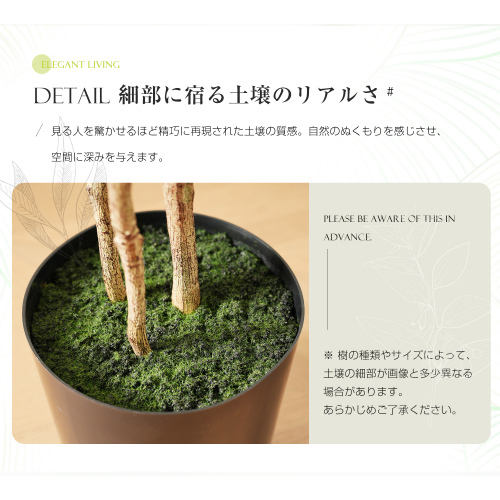 【シンプルなデザイン】優雅なシルエットと柔らかな葉の色合いが特徴のオリーブツリー。お部屋に落ち着きと洗練された雰囲気を添えます。【リアルな葉で癒しの空間に】まるで本物のような瑞々しい葉が、お部屋に自然の心地よさをもたらします。お手入れ不要で、緑を楽しめるインテリアにぴったりです。【リアルな葉の質感が完璧】リアルなオリーブの葉っぱの質感が、本物のヤシの木と見分けがつかないほど精巧に再現されています。葉の色合いは自然のオリーブと同じようにグラデーションが美しく、手に触れたときの柔らかさや質感も本物そのものです。また、枝の曲線や細部まで丁寧に作られており、ナチュラルで高級感のある仕上がりが特徴です。【 自然を感じさせるリアルな枝ぶり】自然を感じさせるリアルな枝ぶりが、まるで本物のヤシの木そのもののように美しい仕上がりです。微細な曲線や枝の配置が、ナチュラルで繊細な印象を与えます。どの角度から見ても自然な雰囲気が漂い、インテリアに温かみと豊かさを加えます。【分解可能なデザインで移動や引越しも楽々】幹は簡単に取り外しが可能な設計で、移動や引越しの際に非常に便利。組み立てた状態では接続部分が全く目立たず、リアルな仕上がりを損ないません。機能性と美しさを兼ね備えたデザインです。※ すべての幹が取り外し可能ではございません。長い幹のみ組み立て・分解が可能です。【※ すべての幹が取り外し可能ではございません。長い幹のみ組み立て・分解が可能です。】見る人を驚かせるほど精巧に再現された土壌の質感。自然のぬくもりを感じさせ、空間に深みを与えます。※ 樹の種類やサイズによって、土壌の細部が画像と多少異なる場合があります。あらかじめご了承ください。【お手入れ簡単でいつでも清潔】防水性を持っているため、汚は、水、白酢または中性洗剤を混ぜた液を含ませた柔らかい布で抜き取ることができます。手間がかからず、常に美しい状態を保てるのが嬉しいポイントです。※ 画像内の樹に使用されている白い鉢は商品には含まれておらず、商品本体には黒いPP(ポリプロピレン)素材の鉢になっております。あらかじめご了承ください。※ 異なるサイズの樹は、幹の形状や葉の密度にわずかな違いがある場合がございます。あらかじめご了承ください