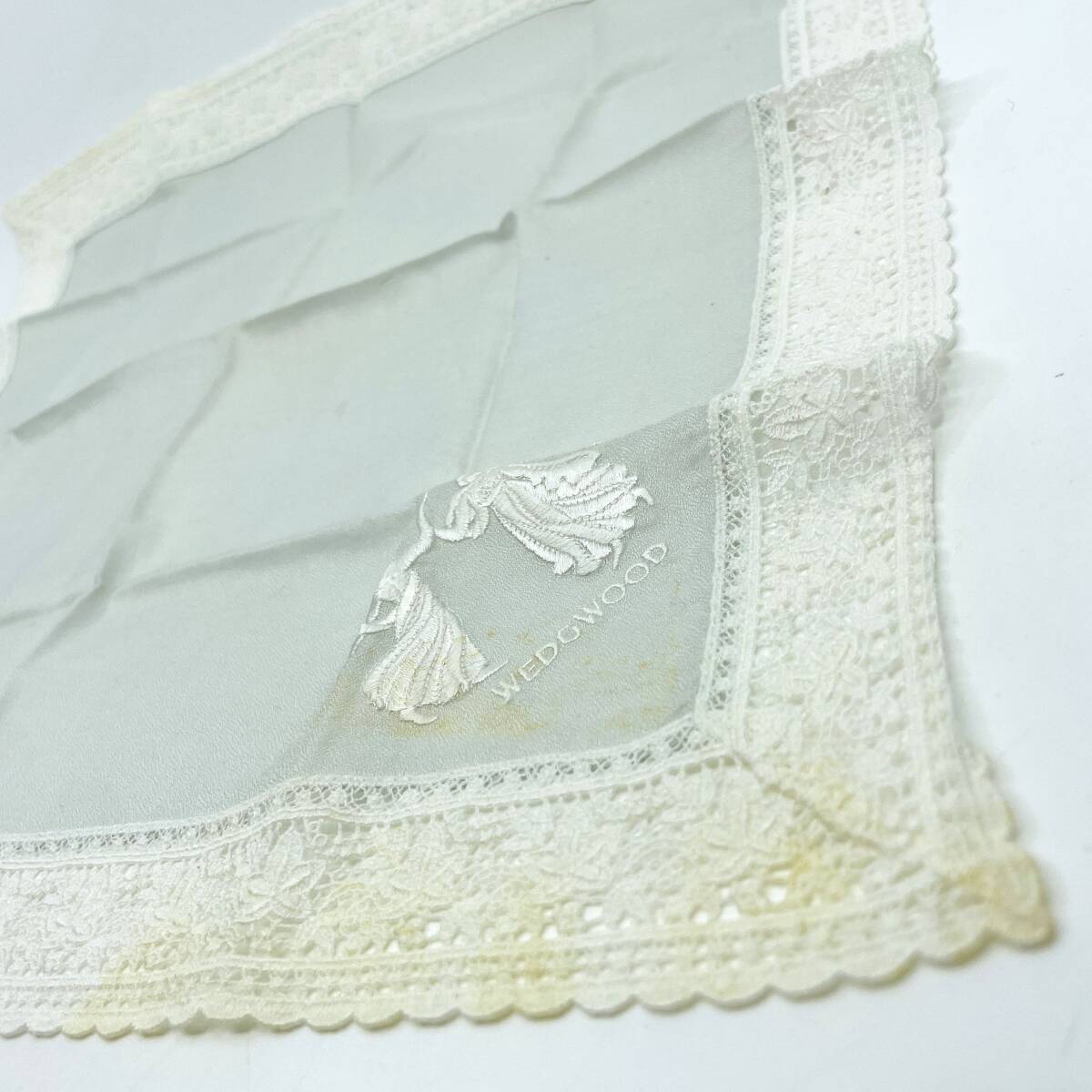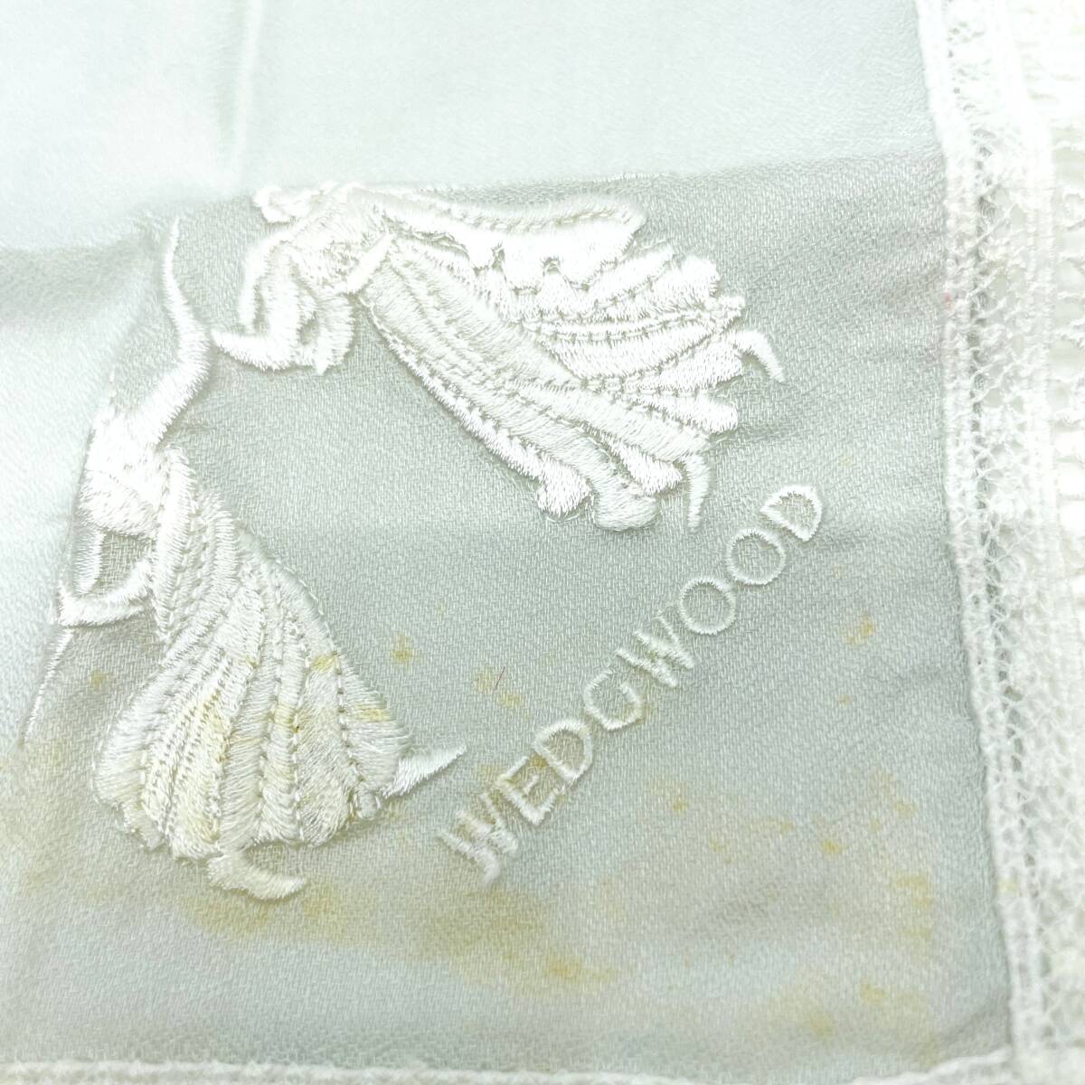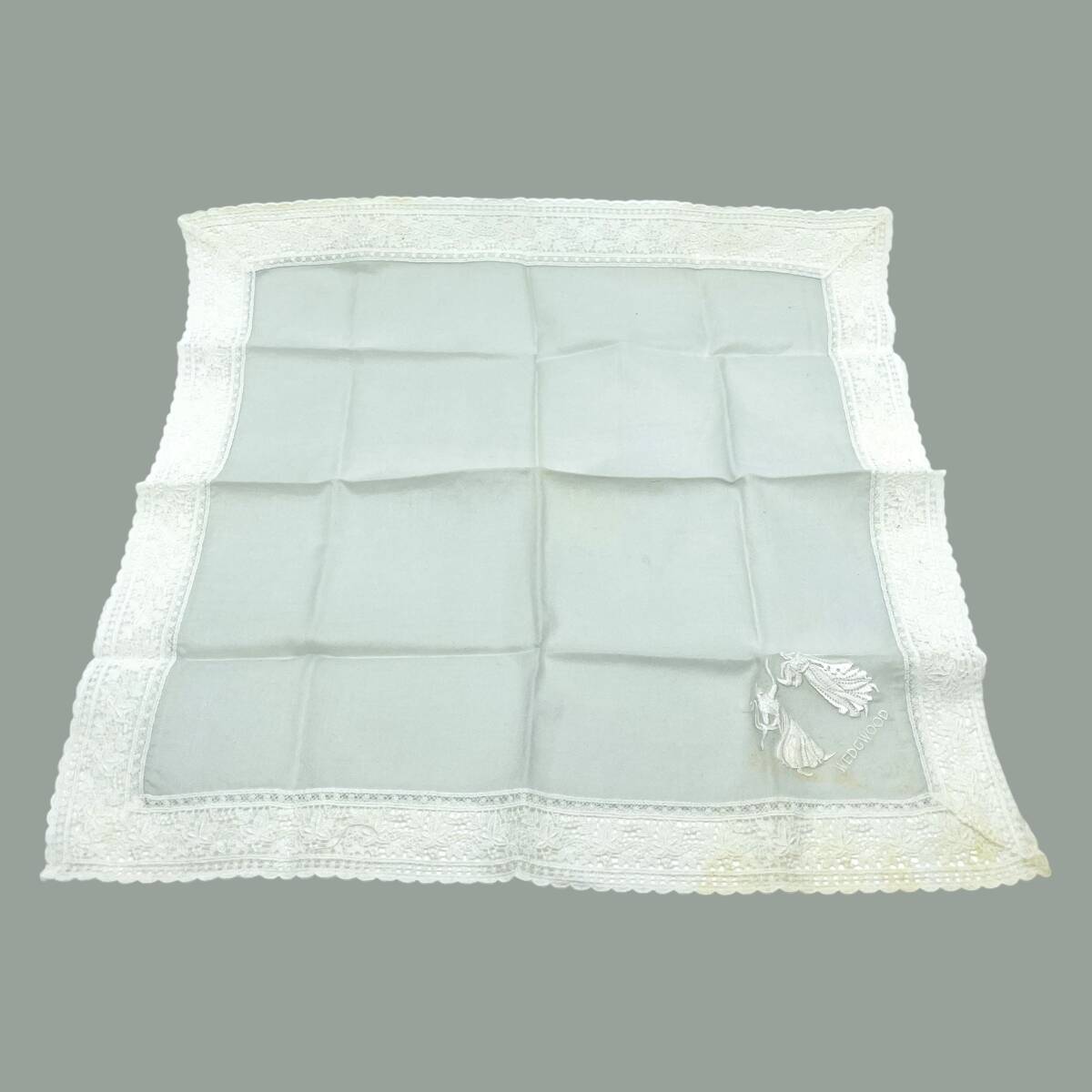 WEDGWOOD ウェッジウッド ハンカチ バンダナ 縁レース ロゴ刺繍 人物 横顔 植物 リーフ ライトグレー系 ラグジュアリー エレガント