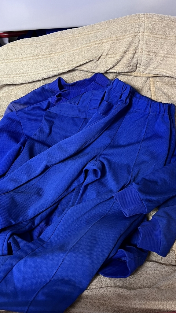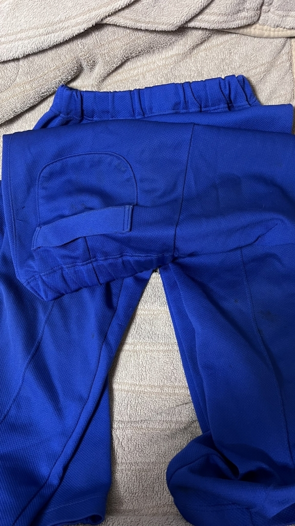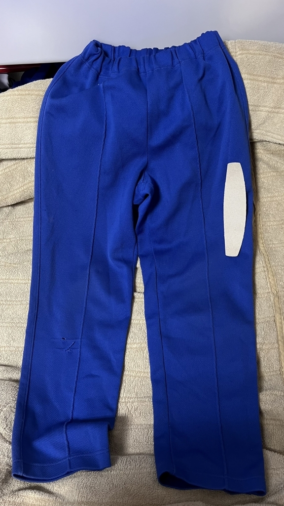 長ズボンの左太腿に団体名が剥がれた痕があります。腰紐ありません。膝に破れ擦れあります。