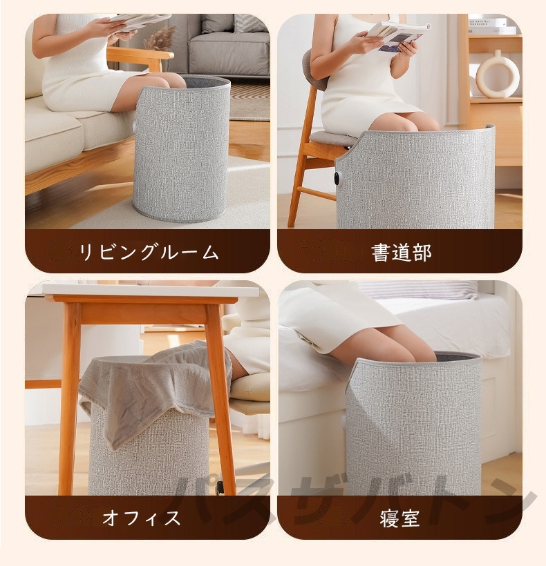 巻き取り式で、収納バンドも付きて、持ち運びも収納もしやすいです。机の下に収まれるコンパクトサイズで、足もとに置いておけばいつでもサッと使いやすいです。どんなシーンでも使いやすい。暖房がない台所、洗面所、トイレ、脱衣場、書斎にも使用できる。猫や犬などのペットも使用できます。