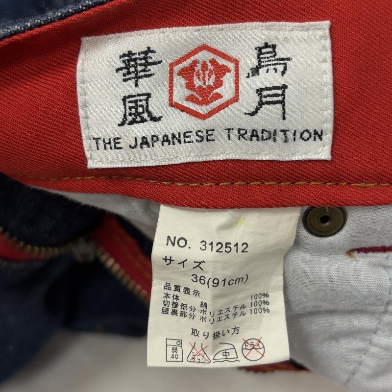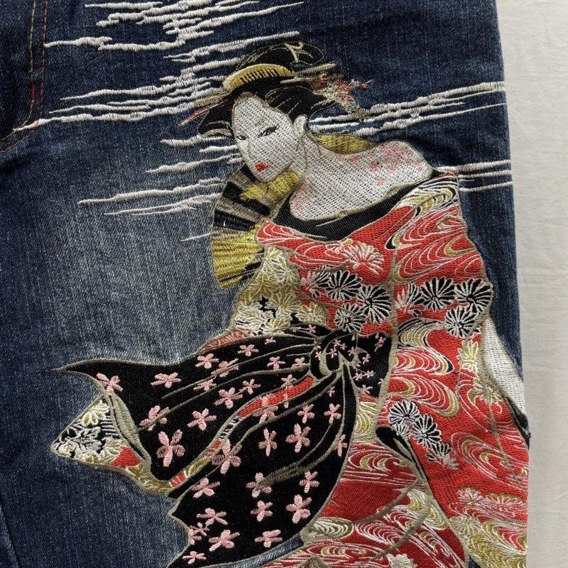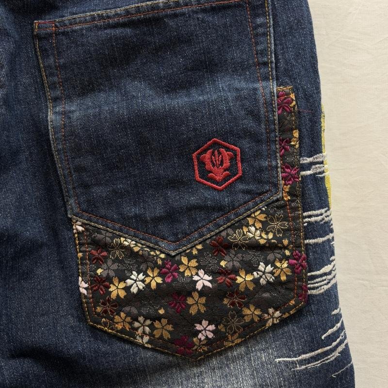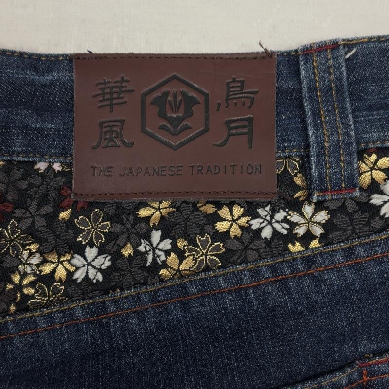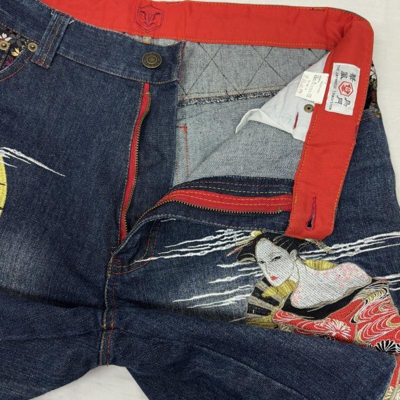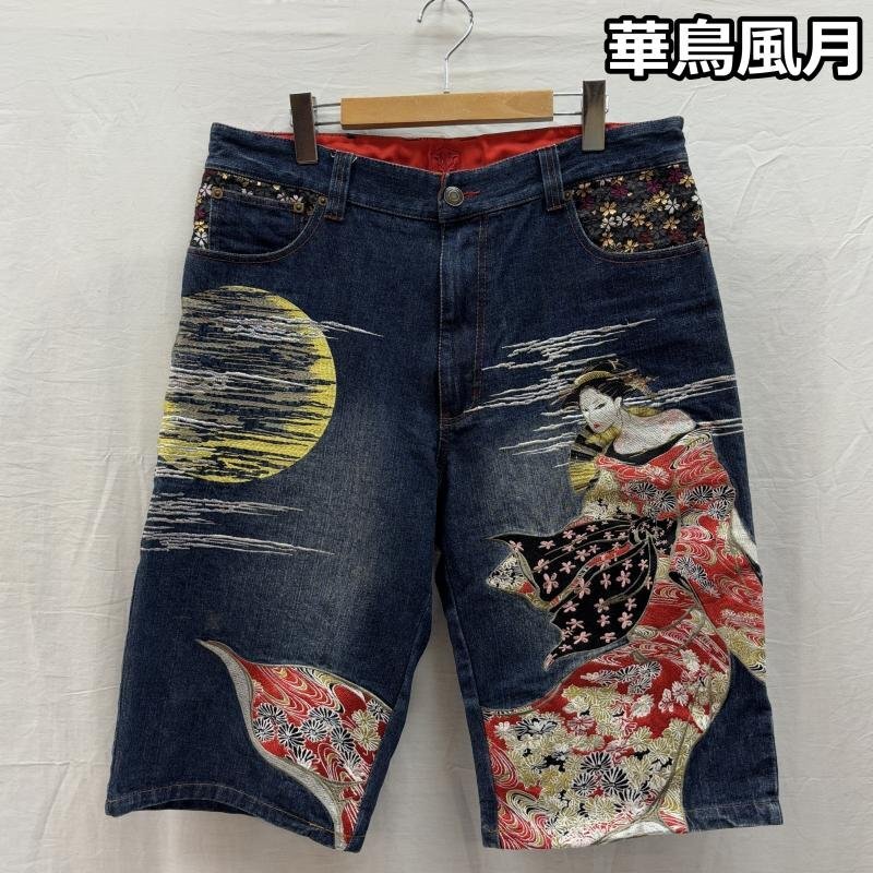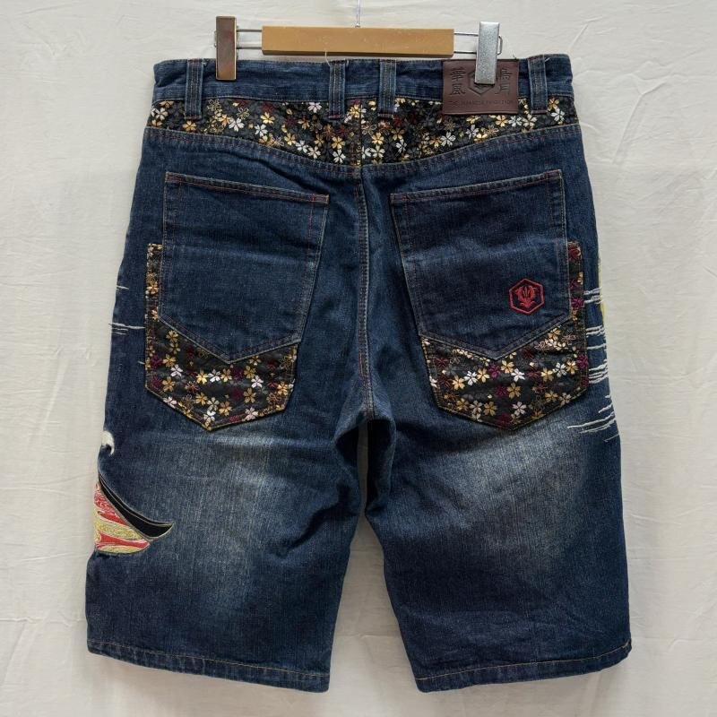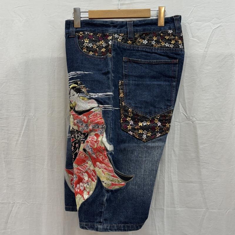 古着 華鳥風月 ワイド デニム ショーツ ハーフパンツ 和柄 刺繍 花魁 桜 36インチ