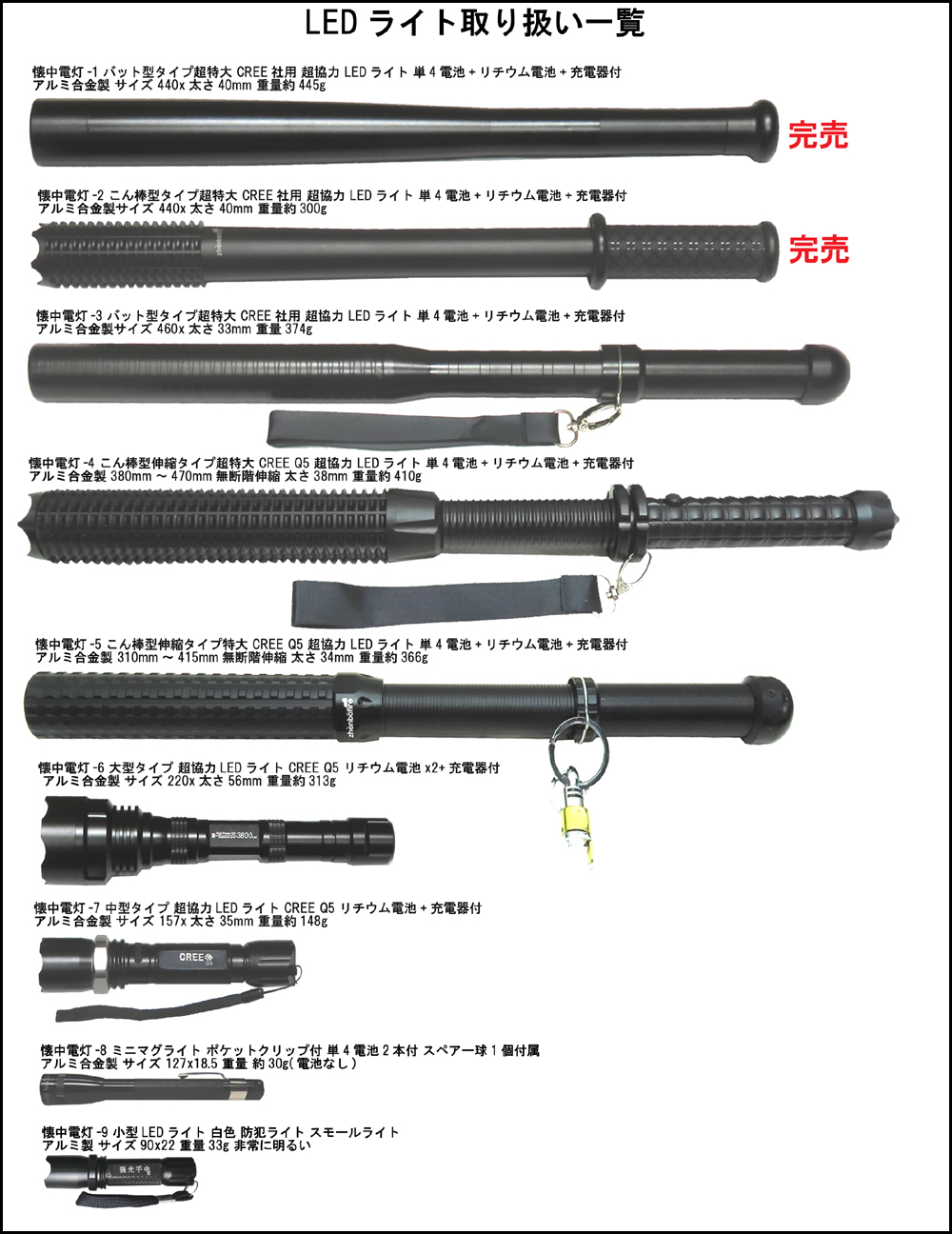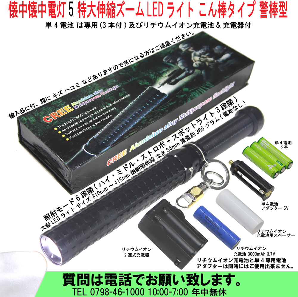 ■懐中電灯5 LEDは世界最高クラスのCREE社製 LED 採用。 ■世界の軍隊・警察機関でも使用されるという強力ライトです。 ■懐中電灯 こん棒タイプ 警棒型 大型LEDライト 電池単4(3本付)及び リチウムイオン充電池&充電器付 ■リチウムイオン充電池 UltraFire 18650 3000mAh 1本(スペーサー付き)と専用充電器付き ■アルカリ乾電池単4(3本付)は専用電池アダプターに入れて使用します。 ■リチウムイオン充電池の充電が少ないときは単4電池3本を電池アダプター に入れてご使用頂けます。 ■リチウムイオン充電池と単4専用電池アダプターは同時にはご使用出来ません。 ■大型LEDライト サイズ 310mm~415mm無断階伸縮 太さ34mm 重量約366グラム(電池なし) ■持ち手を左にひねって伸ばし、右にひねって固定、5mm間隔で調整ができます。 ■照射モードは3段階(ハイ・ミドル・ストロボ) ■材質 T6061 アルミニューム 削りだし製品。 ■日常生活用防水加工 ちょっとした雨の中 又は水しぶきにも壊れにくい。 ■この大型LEDライトで物をたたいたりすると壊れますので叩かないで下さい。 ■付属品 ■単四アルカリ乾電池x3本 専用アダプターx1 ■リチウムイオン充電池 18650 3000mAh UltraFire x1本(スペーサー付x1) ■UltraFire 専用充電器x1(100V~240V対応3.7V/450mA) ■輸入品に付、箱に キズ ヘコミ などありますので気になる方はご遠慮ください。 ■防犯ライト 夜間護身用として安心してご愛用していただけるとおもいます。 ■護身用 アウトドアや停電時の備品としてもあるといつも安心です。 ■安心の為に、壁にぶら下げてください。または車中にあると安心です。 ■夜間警備 ボディーガード 緊急時 災害時 アウトドア 携帯用 痴漢撃退 ■完全点検の上出荷いたしますのでご安心下さい。 ■輸入品に付きキズ ヘコミ などありますので気になる方のご購入はご遠慮下さい。 ■電池交換については、最低限の知識と技術のない方はご遠慮下さい。 ■取扱い説明書はありませんので分かる方のみご購入をお願いします。 ■保障期間 はありませんのでご注意下さい。 ■届きましたらライトの点灯テストしてください。 ■不良品の場合、お送り下さい、交換いたします。 ■大変申し訳ありませんが送料はご負担下さい。粗品をつけて返送致します。 ■メーカー希望販売価格 \10,000円+税 外部リンク その他のLED ライト 外部リンク その他の懐中電灯 ●20230205-80● 出品数が多い為、質問覧からの質問はご遠慮下さい。 質問は大変申し分けありませんがお電話でのみ受けております。 出品者へ質問されて来た方は今後一切の入札が出来なくなりますのでご注意下さい。 ■在庫は有る物として出品しておりますので在庫確認はご遠慮下さい。 ■掲載写真が変更又は追加をすることがありますので定期的に画面を更新してください。 ■新規の方、評価の低い方は入札されますと取消しますのでご了承下さい。 ■悪い評価のある方は入札を取消す場合がありますのでご了承下さい。 ■領収書 納品書 請求書 の発行は行っておりませんので予めご了承ください。 ■商品到着後、直ぐに受け取り連絡をしていただける方のみ入札をお願い致します。 ■受け取り連絡を直ぐにして頂けない方は次回から入札をお断りさせた頂きます。 ■この商品の送料 ヤマト宅急便 80サイズになります。 宅急便 本州 四国 九州 770円(離島含む) 宅急便 宮城 山形 福島 860円(離島含む) 宅急便 青森 秋田 岩手 980円(離島含む) 宅急便 北海道 1400円(離島含む) 宅急便 沖 縄 1540円(離島含む) ■複数 入札 (同梱) ■落札された時点で入札されているものを複数(同梱可能)とみなします。 ■落札後に入札されたものは複数になりませんのでご注意して下さい。(同梱不可) ■複数入札されている方は.1つ目終了後.のこり分を終了させて頂く場合もあります。 ■運送便の送料は複数落札されてもサイズが変わると送料も変わって来ます。 ■複数落札された方は まとめて取引 で送料を連絡させて頂きます。 ■同梱できないサイズも有りますのでご注意下さい。 ■注意 ヤマト宅急便において沖縄県の場合、普通は航空輸送になりますがヤマトの勝手な 判断で危険物と思われる物は航空便にできないと判断して、陸海上輸送になる場合があります。 その場合通常より1週間程度お届けが遅れます。(事前連絡はありません。) お急ぎのかたは余裕をもってお早めにご注文して頂けますようお願い致します。 ■同梱の場合サイズにより送料が変わります。 ■希望があれば佐川急便及びヤマト宅急便のみ送料着払いも可能です。(選択可) |