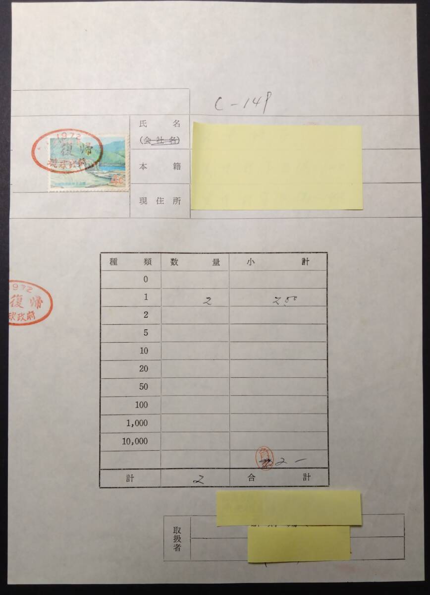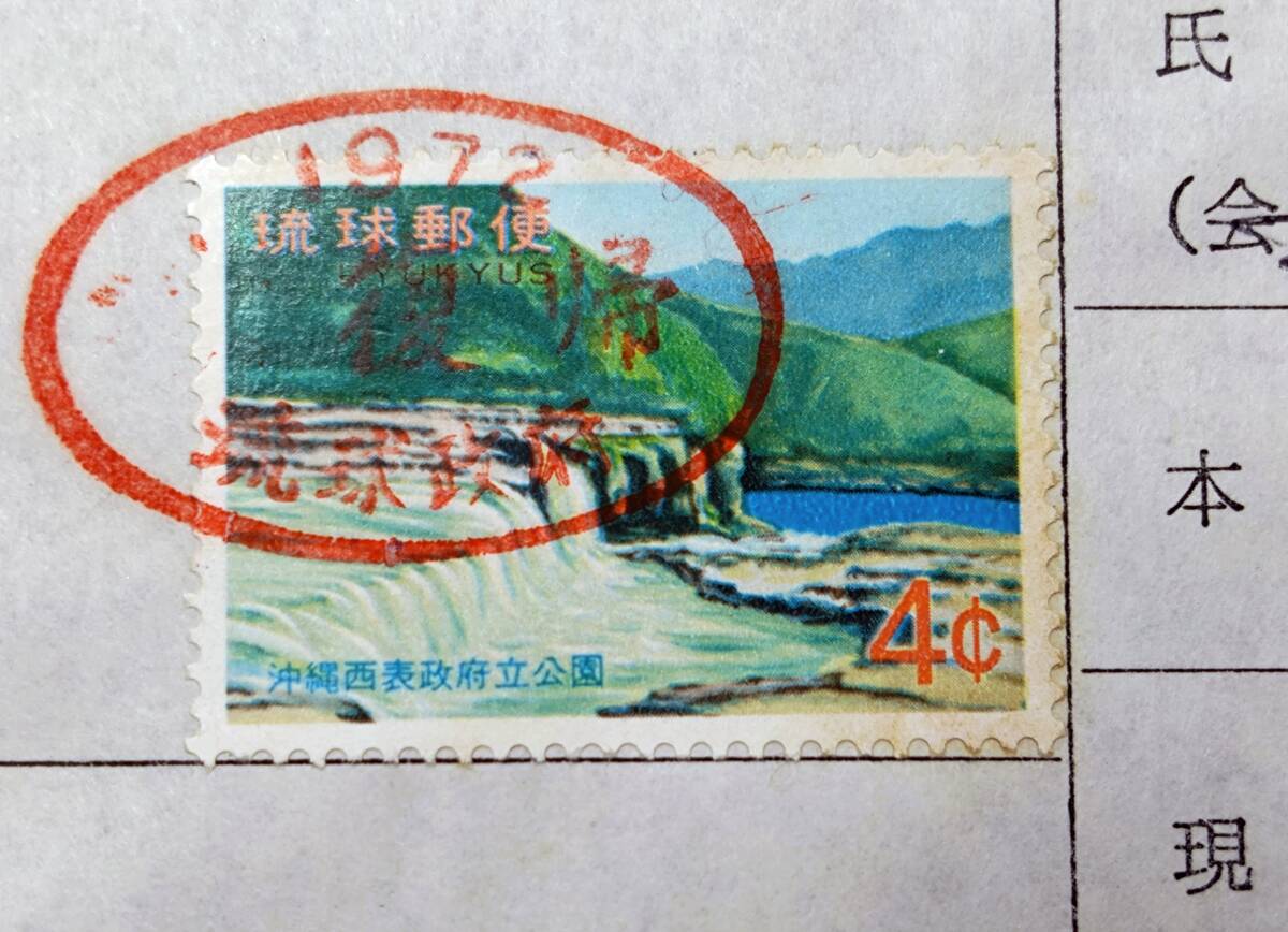 | 【琉球不発行切手沖縄西表政府立公園『マリュウドの滝』赤色印 1972年】 美品 (台紙、切手ともに折り目無し) 沖縄西表政府公園のシリーズの1種として発行が予定されていた『西表島浦内川のマリュウドの滝』でしたが直前に販売停止が決定し、一部が沖縄に返還する際の流通ドルと円を交換する 『通貨確認証紙』として使用されたものです。 令和4年は、沖縄の日本復帰50周年の歴史的な節目の年でした。 日本復帰にかかわる不発行切手を是非、コレクションに加えることを検討ください。 |