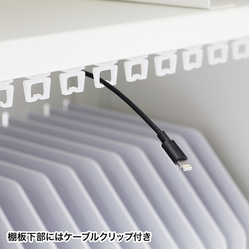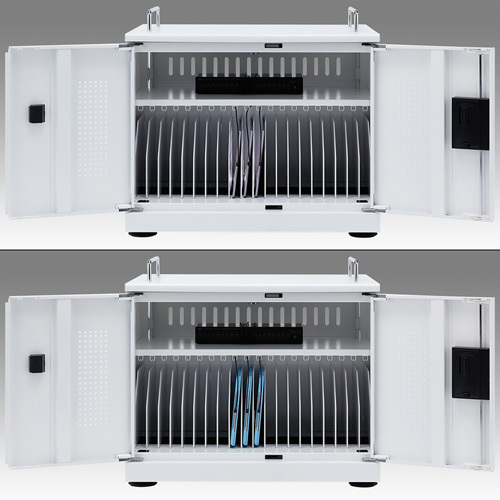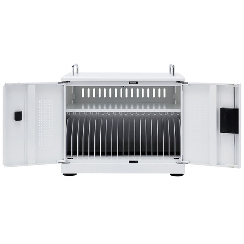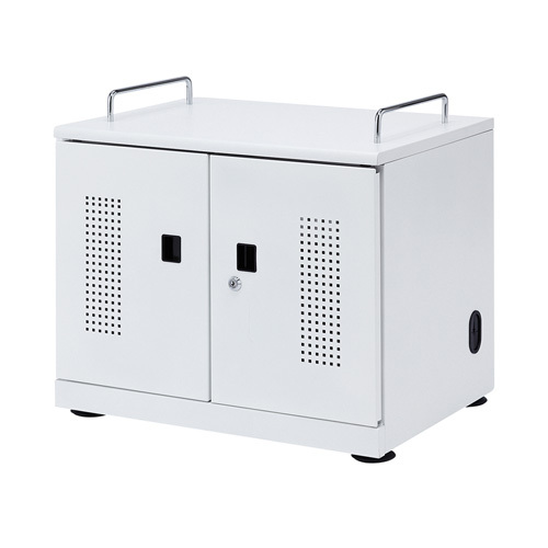 ※配送の送り主はサンワサプライ(株)と記載されています。沖縄・離島配送不可となります。 当店は正規販売代理店です。 特長 タブレットを一括で20台収納できる鍵付き保管庫です。(有効内寸:W25×D280×H215mm:11インチ程度まで対応) 収納部の底部には滑り止めクッション材が装備されています。 充電用のタップ、ACアダプタが置ける棚板が標準装備されています。 背部は鍵付きのバックパネルになっており、配線作業やタップ取り付け時にメンテナンスがしやすくなっています。 前面扉は観音扉になっており、取り出しがしやすいように170°開きます。 仕切板は取り外しが可能です。 収納部は配線に便利なケーブルクリップ付きです。 後部側面にそれぞれ、ケーブル穴があり、本体を壁に近づけて設置した際でも配線がしやすくできるようになっています。 設置時に、キャスター(直径75mm)、アジャスターの取付けが選べます。 ※全高:キャスター取り付け時…615.5mm、アジャスター取り付け時…546mm 気をつけておりますが、タイミングによっては在庫切れの場合があります。 ※キャスターは長距離の移動を想定したものではありません(直径75mm) セキュリティワイヤー(別売り)を取っ手に取り付けて使用可能です。 仕様