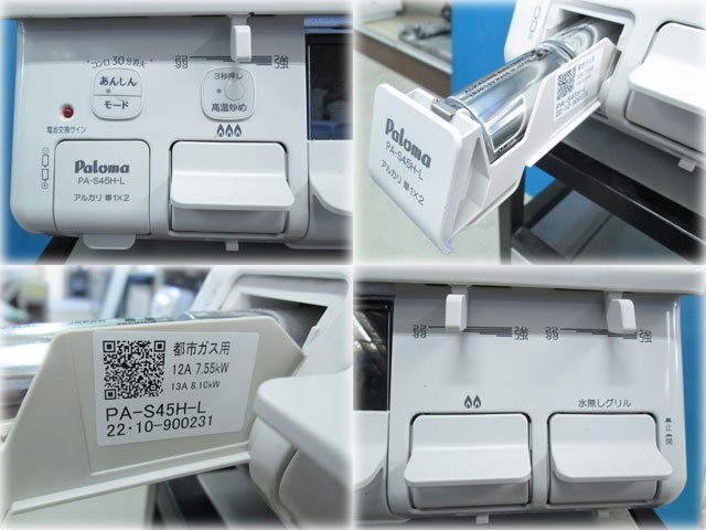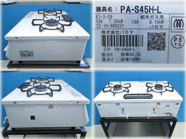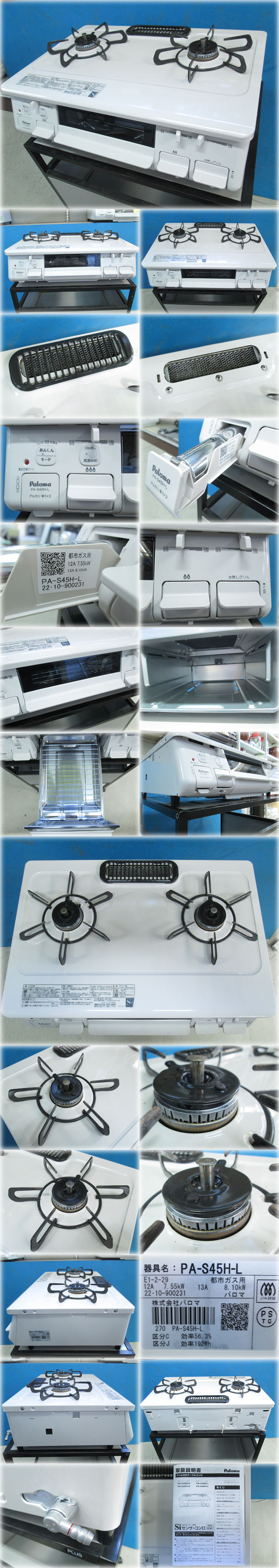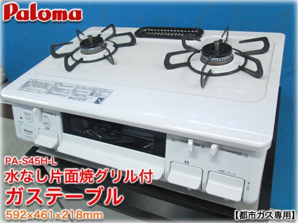 パロマ 水なし片面焼グリル付ガステーブル PA-S45H-L を出品いたします。 ■特徴■ フラット構造 煮こぼれなどが器具内に侵入しにくい 一体成型フラット構造。 汁受け皿がなくホーロー素材で、 ふき掃除もラクラクです。 すっきりクリーンゴトク 洗いやすさにもふきやすさにもこだわった、 やさしいフォルムのゴトク。 はめやすく、ズレにくい3点止めです。 フラットトップ 煮こぼれなどが侵入しにくく、 汚れもサッとふき取れます。 見た目もすっきりときれい。 ホーロートップ ホーロートップなら、 丈夫で耐久性にすぐれ、 しっとりと落ち着いたツヤがあります。 コンロ30分消火あんしんモード ボタンをひと押しするだけで 通常消し忘れ消火120分のところ 30分で自動消火。 他事をしている時のついうっかりの 消し忘れもフォローします。 焦げつき消火機能 鍋底が焦げつき始めると 自動で消火します。 ■仕様■