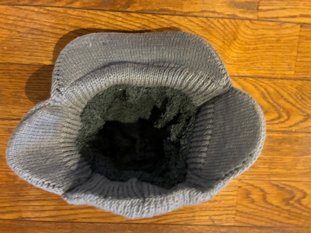 内側ウールボアで、顎下でワンタッチバックルのナイロンベルト留め(長さ調整可能)です。