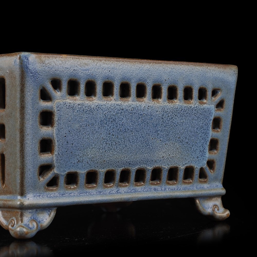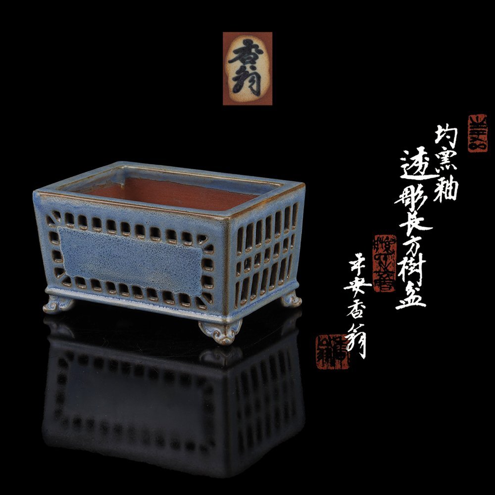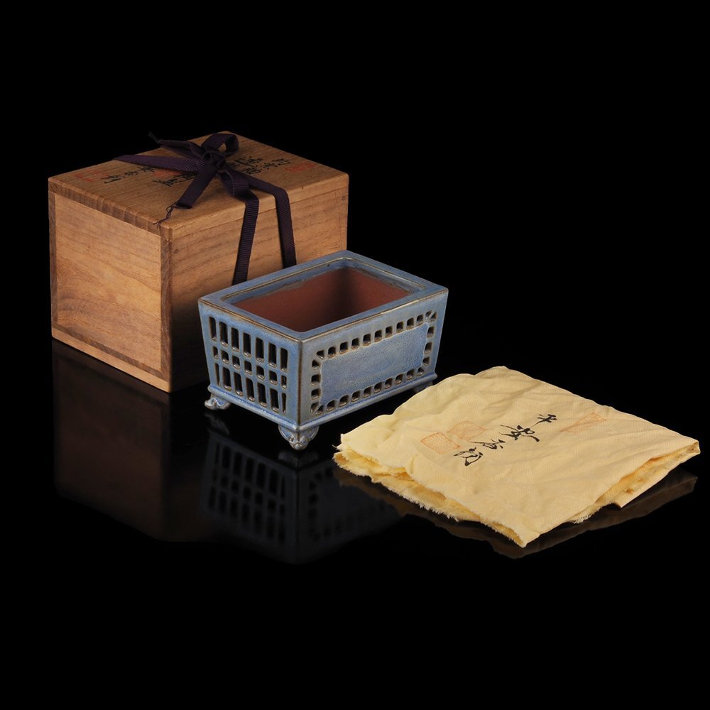 【平安香山(1905年~不明) 日本樹鉢界において平安東福寺と並ぶ巨匠として名高い。 13、14歳の頃から盆栽業を営み、23歳頃から鉢の作陶を始める。 元々盆栽業から転じただけに盆栽に対する認識があり、 実用と鑑賞の二面性をよく念頭に置いた鉢づくりである。 香山の隙のない正確な歪みのない作陶は「カミソリ香山」と呼ばれた。 1973年に子息に陶号「香山」を譲り、自ら「香翁」と号した。】 本作品は、香山の浮彫と並んで陶技の冴えの見られる透彫の代表作。 2種の違った透彫を施した名品です。 香翁、在銘。 共箱、真物保証。 |