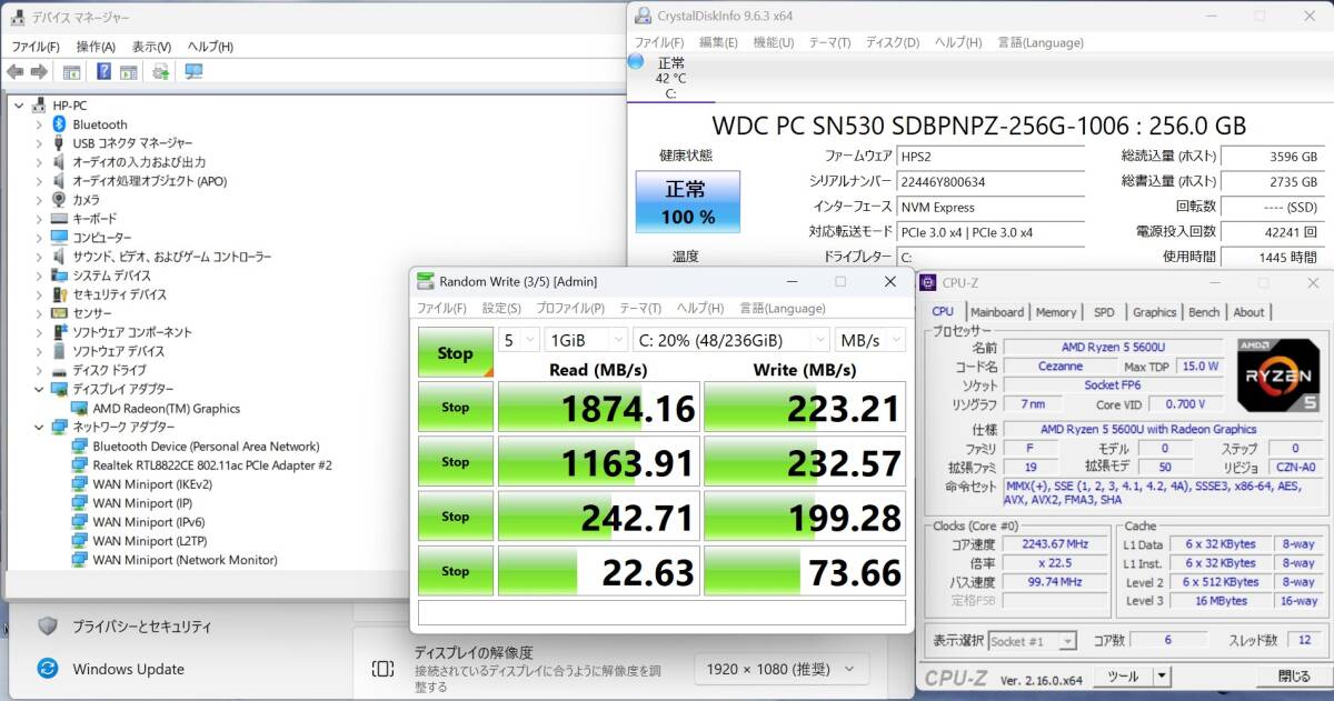 | CPU: 超高速 高性能 AMD Ryzen 5-5600U 2.3Ghz、 6コア12スレッド (ターボ・ブースト利用時の最大周波数 4.2GHz) |