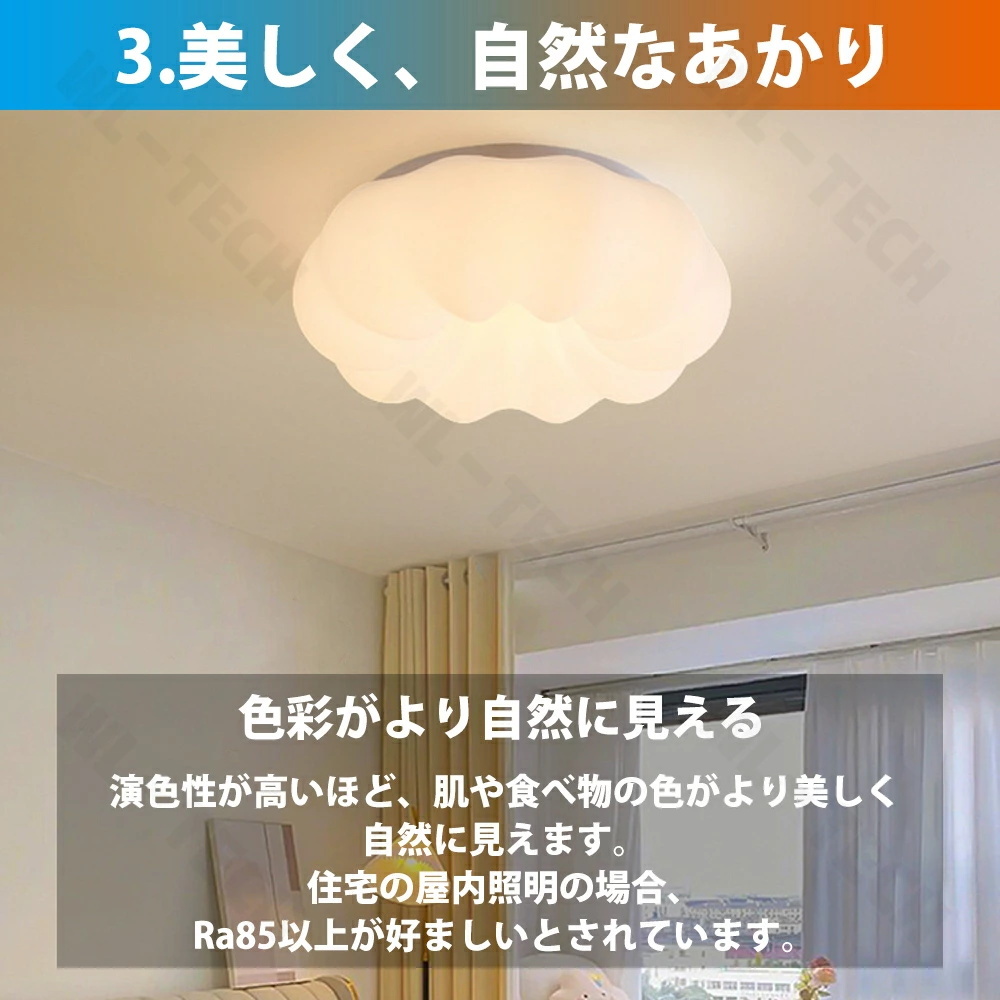 演色性が高いほどのシーリングライト、自然光に近いとされているので、文字がはっきりと見やすく、花の色や料理の色や人の肌色美しく自然に見えます。廊下、和室、寝室、洗面所、居間、書斎、トイレ、天井照明、キッチン照明が最適です。
