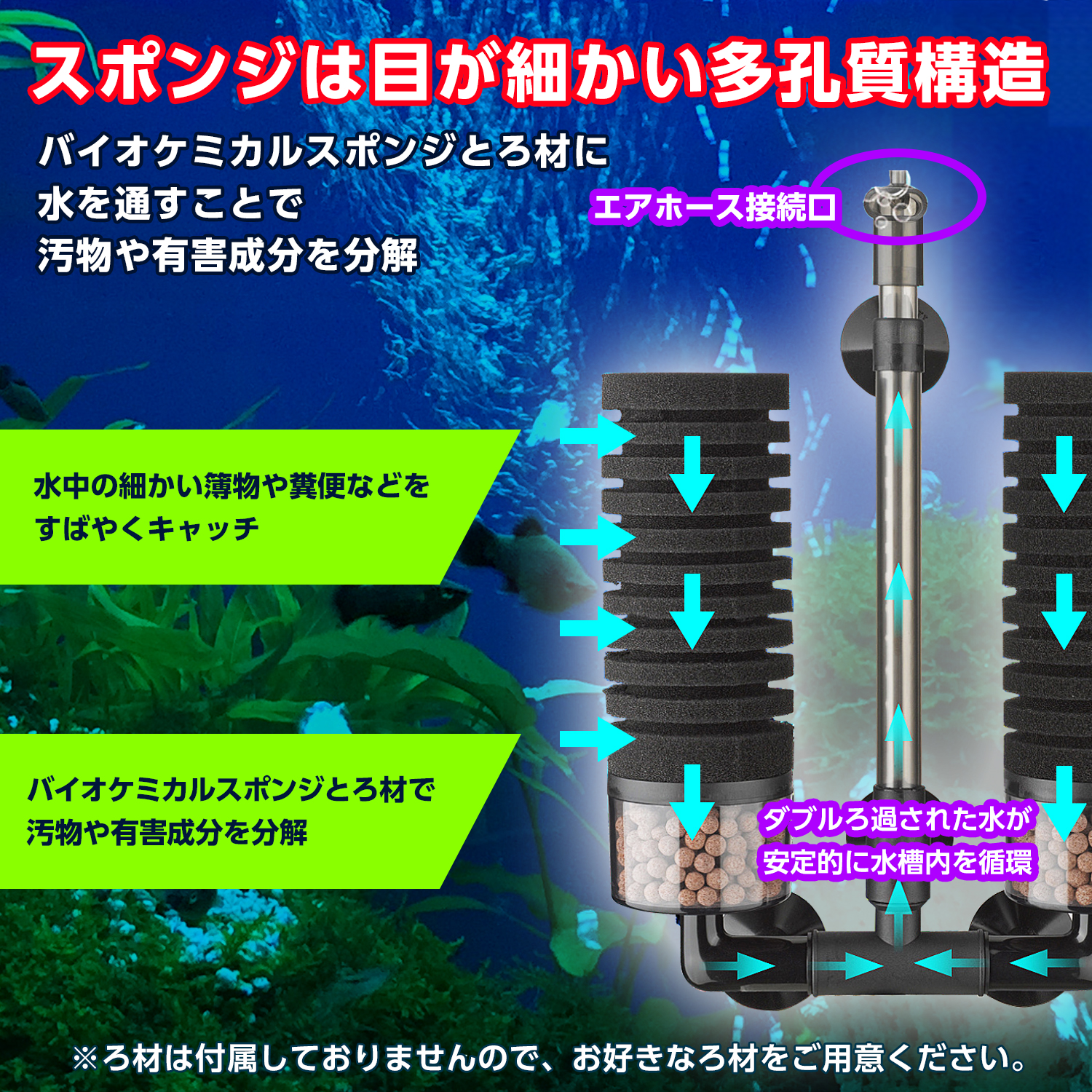 【取り扱い簡単】水槽内のお好きな場所に設置してポンプ(別売)と接続すればすぐに使用可能な使いやすさ抜群の水槽用フィルターです。 【理想の槽内環境】バイオケミカルスポンジとろ過材で汚物と有害成分を徹底的にダブルろ過。浄化された水環境では大切なペットの病気を防ぎ、水槽内の汚れや嫌な匂いの発生も抑えられます。 【理想的な設計】ろ過された水には細かな気泡と大量の酸素が溶け込んでおり、細かな気泡が目詰まりも防ぎます。しっかり動作しながら、動作音はとても静かです。 【安定した水質保持】バイオケミカルスポンジで効率的にバクテリアを培養し、魚や水草の新陳代謝をアップ。さらに有害物質を無毒化し、水質を安定させる役割を果たします。 【商品仕様】◆サイズ:スポンジ…直径60mm×高さ130mm、濾過器…高さ40mm ◆チューブ伸縮高さ:270~420mm ◆重さ:369g ◆素材:プラスチック ◆適用水槽高さ:300~600m ◆適用水量目安:75L程度 ※接続されるポンプのパワーにより適用水量は異なります。 |