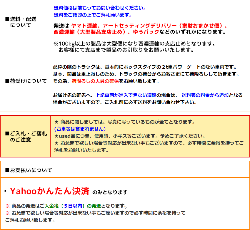 ■お知らせ ・定休日 毎週日曜日、祝祭日は定休日となっております。この間、取引ナビ等ご連絡は出来ませんのでご了承下さい。 ・営業時間 9:00~17:00迄となっておりますのでご連絡等は時間内にお願い致します。 上記時間外は取引ナビや電話でのご連絡は致しませんのでご注意下さい。 ■落札時の注意 ★落札後3日以内(当社定休日は日数に含まれません)にご連絡及び5日以内にお支払い頂けない方は落札者都合でのキャンセルとさせて戴きます。 ★また、その場合自動的にヤフー側から[非常に悪い落札者]としての評価が付きますのでご了承下さい。 ★落札後のキャンセルは落札価格の20%をお支払い頂きます。 ■発送時の注意 ●基本的に大型商品配送の場合は直接のお引取りとさせていただきます。配送の希望の方は必ず質問欄から発送希望のお問合せをしてください。 お近くの営業所留めとなりますが、発送可能な大型商品も御座います。 ■関東圏内では自社配送も行っておりますので含めお問合せくださいませ。いかなる場合でも着払いは受け付けておりませんのでご注意下さい。 ※自社配送の場合ご希望でありましたらご指定のご住所前での車上のお渡しは可能です。 ※送料は元払いです。梱包料が含まれているため、着払いでの発送は行っておりません。 ●着時間のご指定は出来ません。※夜間の配送は承っておりませんのでご注意下さい。 ●基本的に日曜、祝日着は出来ません。 ●配達の際のトラックは基本的にボックスタイプの2t車パワーゲートの無い車両にて配達しております。 ●車上渡しにつきましては原則お客様がトラックの車上から商品を降ろす形となりますので、 十分な人手かフォークリフトをご用意していただくようお願いいたします。 ●着時間の目安は9時~17時の間となっております。 ※それ以外の時間帯の場合別途費用が掛かる場合がご座いますので予めご確認下さい。 ●尚、ドライバーさんは設置場所への搬入などはお手伝いできませんのでご了承下さい。 ●運送会社の指定は基本的に受け付けておりません。 ●代引き、着払いは受け付けておりません。 ■運送会社との契約上、下記のような場合は営業所へ持ち帰らせて頂きます。 【例:荷受人4~6名必要な商品の配送時】 ・人数不足等 ・荷受人が4名以上いるが予想以上に重くて降ろせない等 ・ご承諾を得た上で発送している事になりますので、荷受けできず諸経費が発生しても 当方では負担致しかねますので、必ず必要な荷受人を揃えて頂けるようお願い致します。 ※巻きダンボールとエアキャップの簡易梱包になります。 ※自社配送の場合は梱包等は致しません。毛布や緩衝材での運び用のアテ物で運搬致します。尚、商品の運搬中の保証は御座いません。 ※配送中の商品の取扱い注意を促す為に、商品写真を表面に貼る場合がご座います。 ■保障に関して ★【保証】については初期不良(商品到着後7日間)のみとさせて頂きます。商品到着後すぐに動作確認を行って下さい。 ★商品の保障につきましては商品代金迄の保障となりますのでご了承下さい。 ★製品の動作保障のみとなりますので搬入設置搬出費用等は負担致しませんのでご注意下さい。 ■返品、修理等の注意 ●7日以内にご連絡が無い場合如何なる状況でも保障の対象外となりますので必ず不具合を確認致しましたら 早急にご連絡をお願い致します。 例:商品到着後7日以内に不具合を確認してはいたが、騙し騙し使っていて10日後に壊れた等の場合は、 不具合を確認した時点でご連絡がない限り保障対象外となります。 ●中古品の販売となりますので細心の注意は払っておりますが、写真、型番等で解る製品状態に対するクレームに おきましても、保障は致しませんので必ず質問を頂けるようお願い致します。 ●保障は製品の本体のみの対応となり、付属品に関しては保障対象外となります。ご不明な場合は必ず事前にご確認を お願い致します。 例:シンクの蛇口・排水、給水ホース類・ガスホース類等 ●当社へ連絡無く修理、改造等を行った場合いかなる状況に置きましても、返金・返品・修理代の支払い等の 対応は致しませんのでご注意下さい。 ■商品の在庫 当社では店頭での販売をしておりますのでそちらで売約された場合、ご落札後に在庫が無い場合がご座いますのでご了承下さい。 発送前点検を行う商品もございますが、その時点で不具合を確認致しましたらキャンセルとなりますのでご了承下さい。 ■お取り置きに関して 原則的にお取り置きは2週間以内となっております。 落札後2週間を超過するお取り置きを希望の場合別途費用、又は落札者都合にてキャンセルとなりますので必ず落札前にご連絡お願い致します。 ■評価の流れ 基本的に当方から評価をする事はございませんが、ご落札者様から評価を頂きましたらご返事としてこちらから評価をする形となっております。 評価がいらない場合、当方への評価を頂かなければこちらから評価をする事