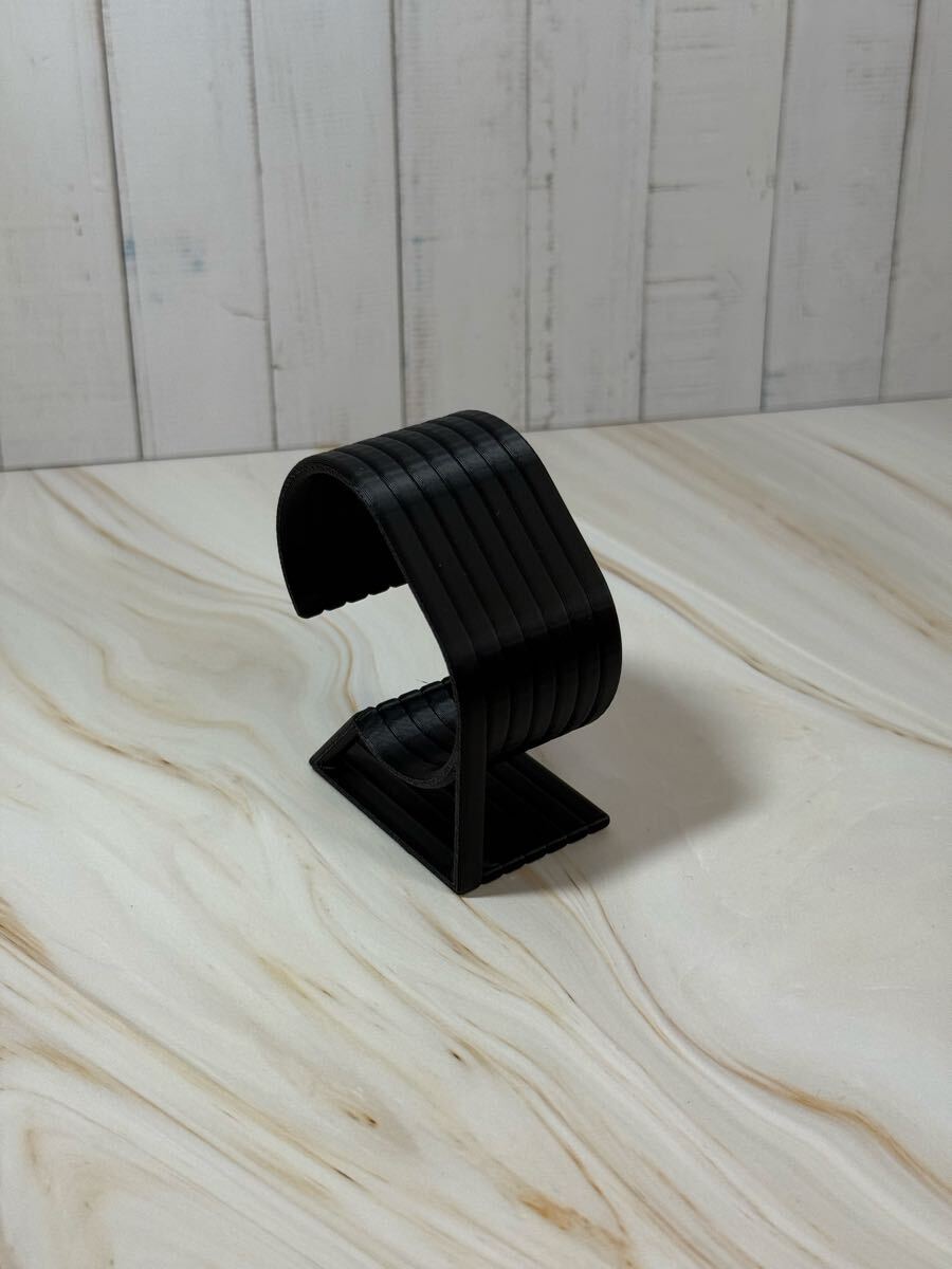 曲線的な形状が特徴で、腕時計を自然な形で保持し、コレクションの展示や普段使いの時計置き場としても便利です。ブラックカラーで落ち着いた雰囲気を持ち、インテリアを選ばずに馴染みます。