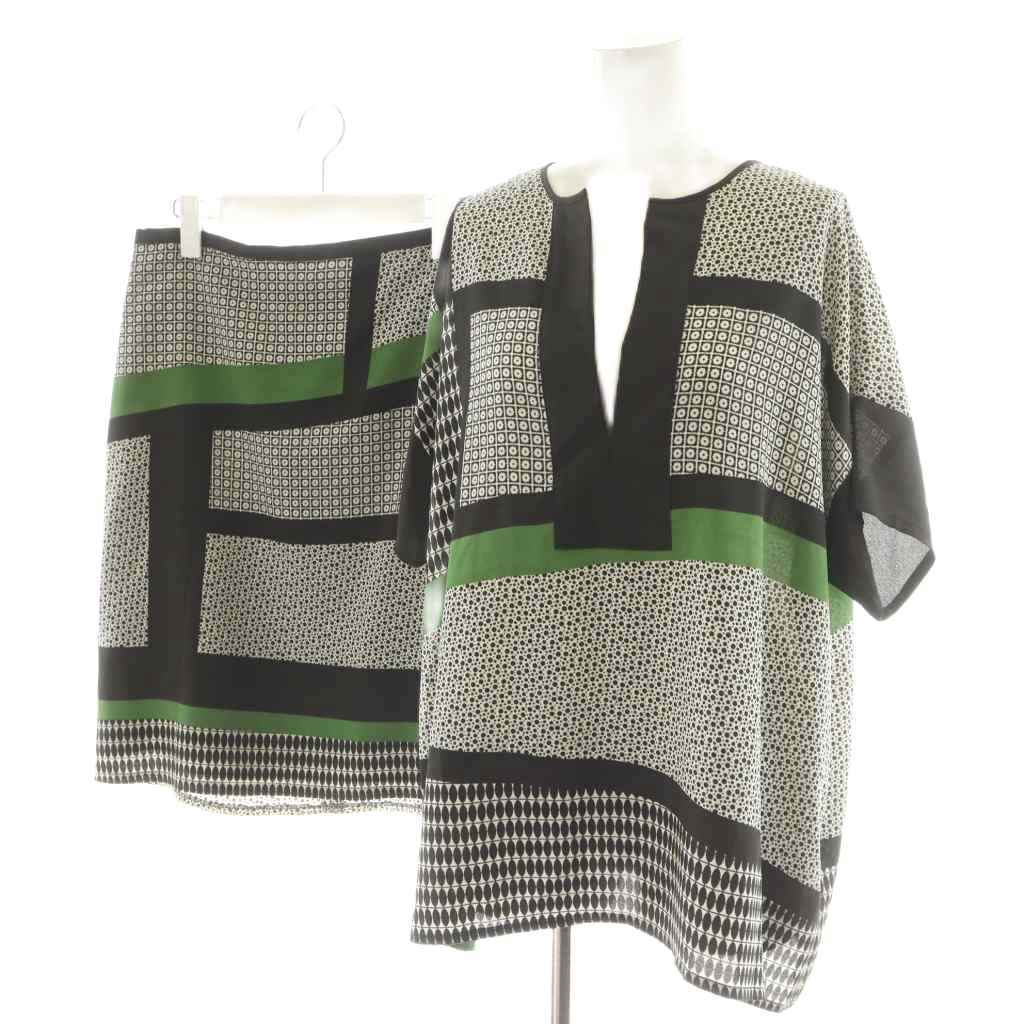 モガ MOGA セットアップ シャツ ブラウス 半袖 フレアスカート ひざ丈 総柄 2 黒 ブラック 緑 グリーン /AN48 レディース