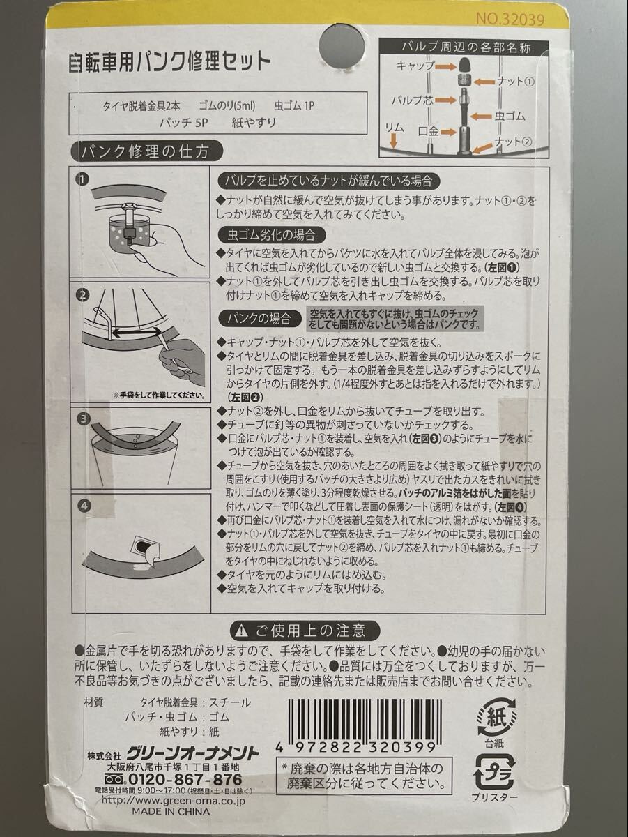 内容物: 自転車のパンクを自分で修理するために必要な以下の基本的な道具が含まれています。