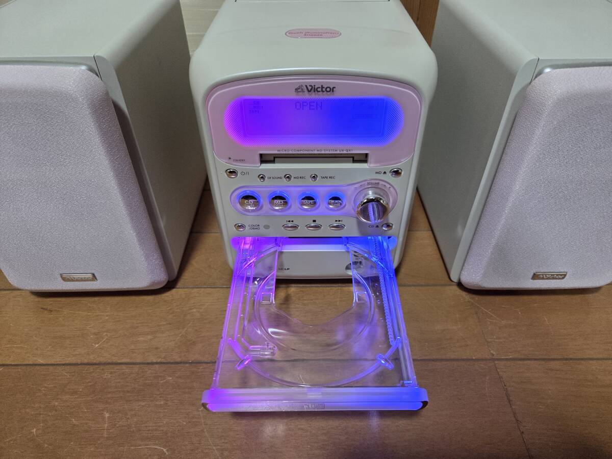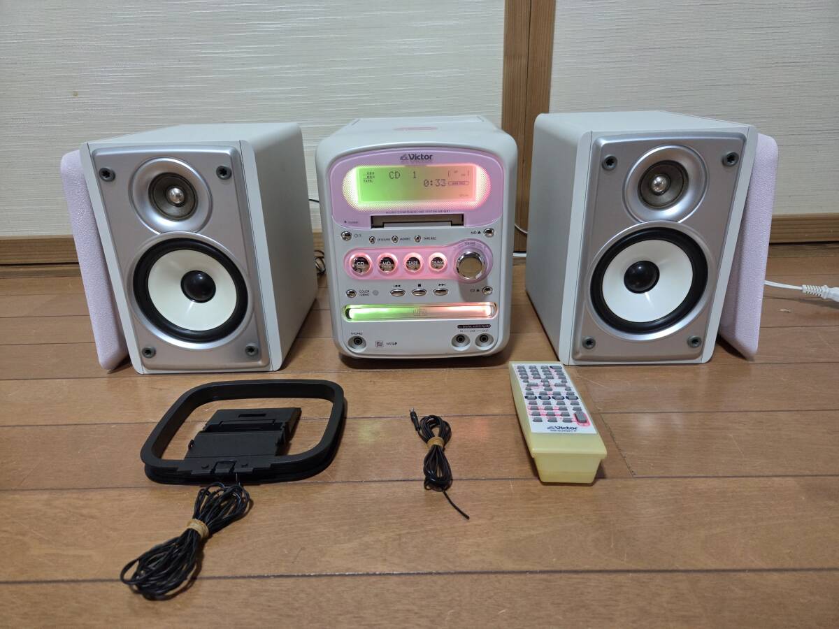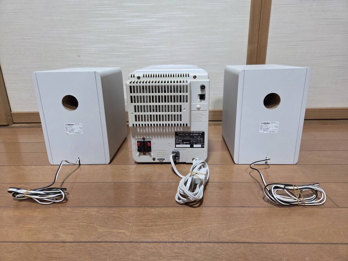 ビクターのマイクロコンポーネントmdシステム、ux-qx1、スピーカー、リモコン、am、fmアンテナです。画像の様にcd再、md、カセットテープ、音だし確認しました。画像にはありませんが、am、fm受信、音だし確認しました。リモコンは全てのボタンで発行する事を確認しました。他は一切確認していません。発送はヤマト運輸の着払いです。中身を入れ換えてクレームを言う方が居ます、ノークレーム、ノーリターン、ノーキャンセルです。