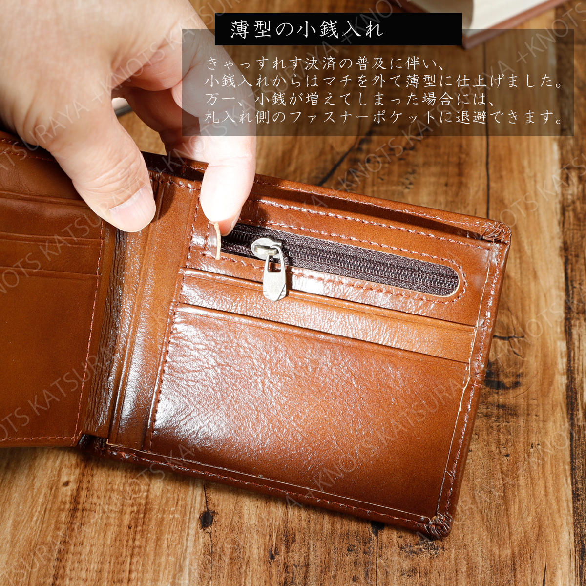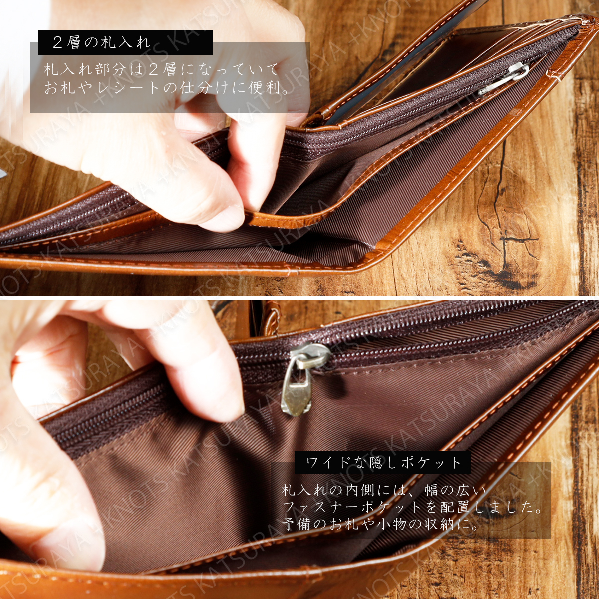 流行に左右されないベーシックなデザインの本革二つ折り財布です。高品質で質感の高い本革素材を採用、内部にも外側と同じ本革を使用しています。大容量、フリーポケットを併用時には最大15枚のカード類が整理できます。ファスナータイプの小銭入れはマチを使わないことで薄型を実現、万一小銭が多くなってしまった場合にも札入れ後ろのファスナーポケットで対応できます。使い勝手を重視しシンプルで飽きの来ないお財布をお探しの方におすすめです。