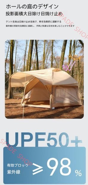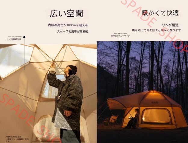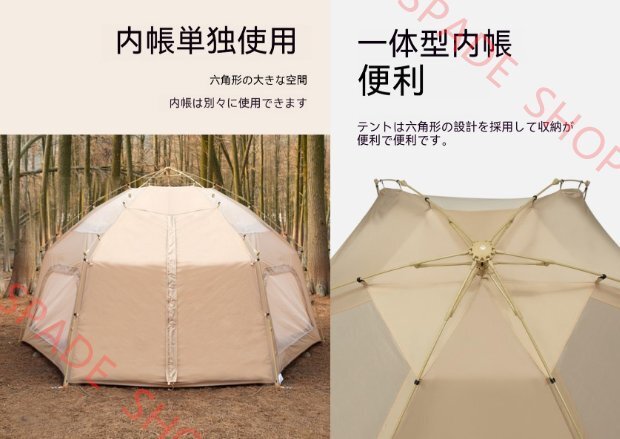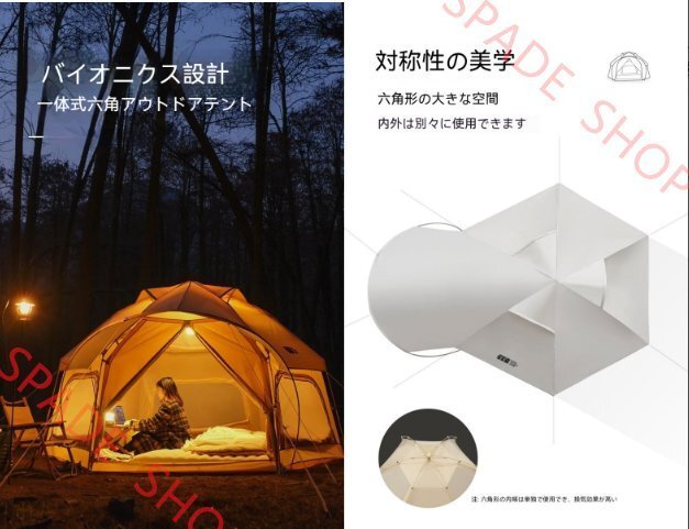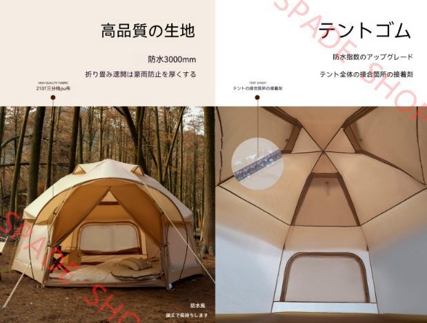 1. **高品質の防水生地**: 210T 3グリッド PU 布で作られており、防水指数は最大 3000mm です。厚めのデザインにより、大雨を効果的に防ぎ、悪天候でも車内が乾いた状態を保ちます。 2. **日焼け防止と断熱**: テント生地には日焼け防止機能があり、紫外線と熱を効果的に遮断し、快適なキャンプ環境を提供し、長期の屋外活動に適しています。 3. **広々とした空間設計**: 六角形の広い空間設計、インナーテントの高さは180cmを超え、家族や複数人でのアクティビティに適した十分なスペースを提供します。 4. **便利なセットアップと折りたたみ**: 自動クイックオープン設計で、セットアップが簡単で素早く、折りたたんだ後の持ち運びも簡単で、頻繁に移動するキャンパーに適しています。 5. **多機能使用**: インナーテントは単独で使用でき、玄関の中庭のデザインにより投影面積が拡大し、日よけと日焼け防止を提供しながら、使用の柔軟性が向上します。 キャンプテントは、軽量で高級感と実用性を兼ね備えた、アウトドア愛好家向けに設計された高性能テントです。テントは、最大 3000mm の防水指数を備えた 210T 3 グリッド PU 生地で作られており、大雨でも内部が乾いた状態を保ちます。この生地には日焼け防止機能があり、紫外線と熱を効果的に遮断し、あなたとご家族に涼しく快適な休息環境を提供します。 テントは六角形の広い空間設計で、インナーテントの高さは180cm以上あり、アクティビティに十分なスペースを提供し、家族や複数人での使用に適しています。自動クイックオープン設計により、セットアップが簡単かつ迅速になり、折りたたんだ後の持ち運びも簡単なので、頻繁に移動する必要があるキャンパーに最適です。また、インナーテントは単体でも使用でき、玄関ホールの設計により投影面積が拡大し、日焼け防止だけでなく使用の柔軟性も向上します。 週末の家族キャンプでも、長いアウトドアアドベンチャーでも、キャンプ用テントは快適で安全な生活環境を提供し、自然の楽しさを満喫できます。 |