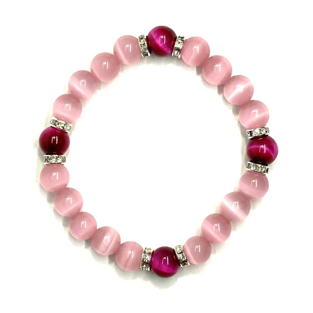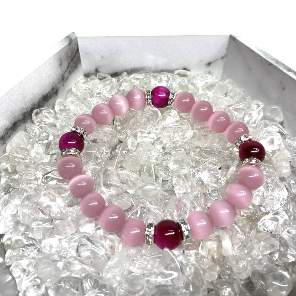 こちらは、キャッツアイとピンクタイガーアイを組み合わせたブレスレットです。間にはロンデルを挟み高級感あるデザインに仕上がっています。石大きさは腕にも馴染みやすいように10mm玉で内周約17cmです。数に限りがございますので気になる方はお早めにどうぞ。