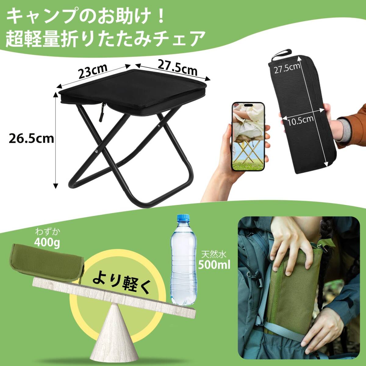 • 【極限軽量】軽量折りたたみ椅子はわずか 400g で、一般的な水筒より軽い!収納寸法 29×11×5cm とコンパクトで、リュックやバッグに簡単に収まり、外出時の持ち運びは全く負担になりません。